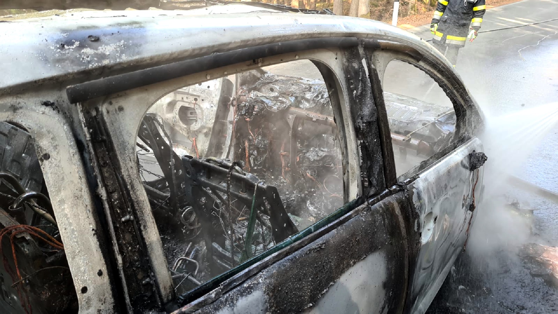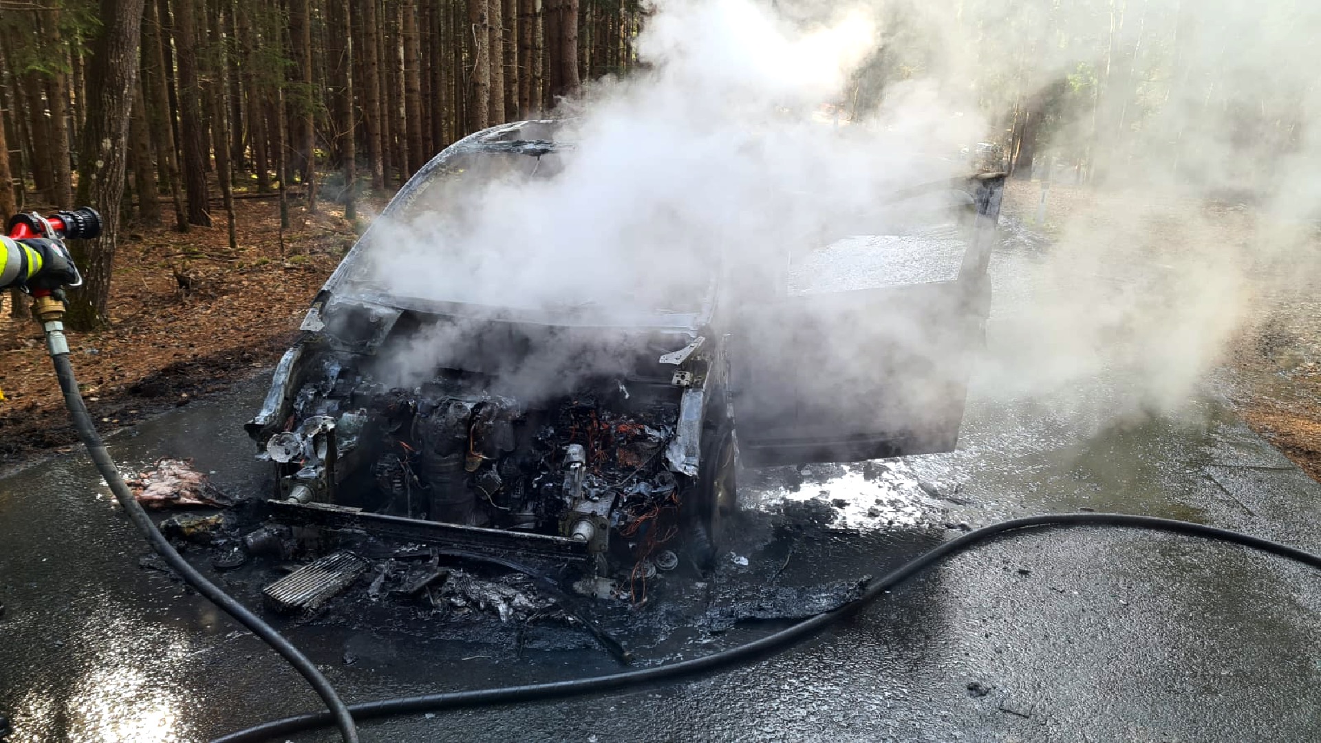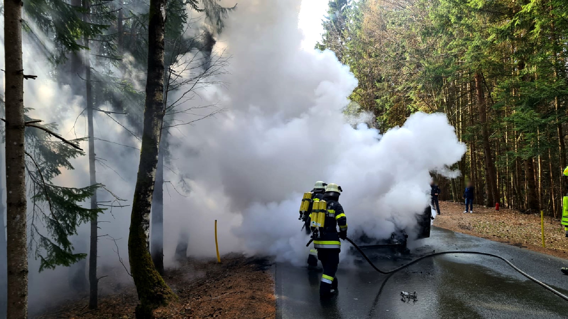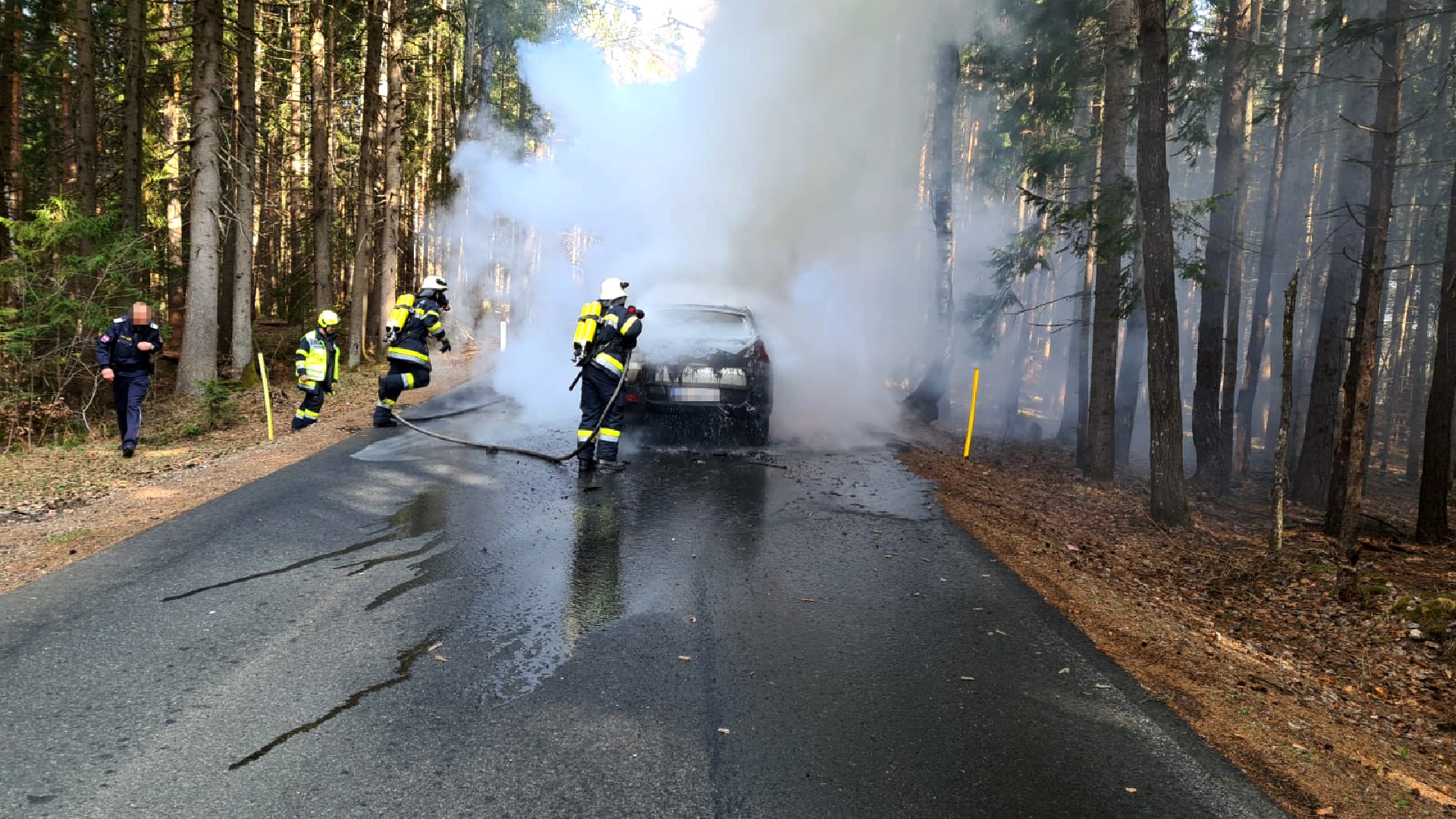 Der in Vollbrand stehende PKW wurde durch die beiden Feuerwehren unter schwerem Atemschutz gelöscht. Die umliegenden Bäume fingen aufgrund der starken Hitzeentwicklung ebenfalls Feuer. Das Fahrzeug brannte vollständig aus, es kam jedoch zu keinem Personenschaden. Während der Lösch- und Aufräumarbeiten war die Straße für über eine Stunde vollständig gesperrt.