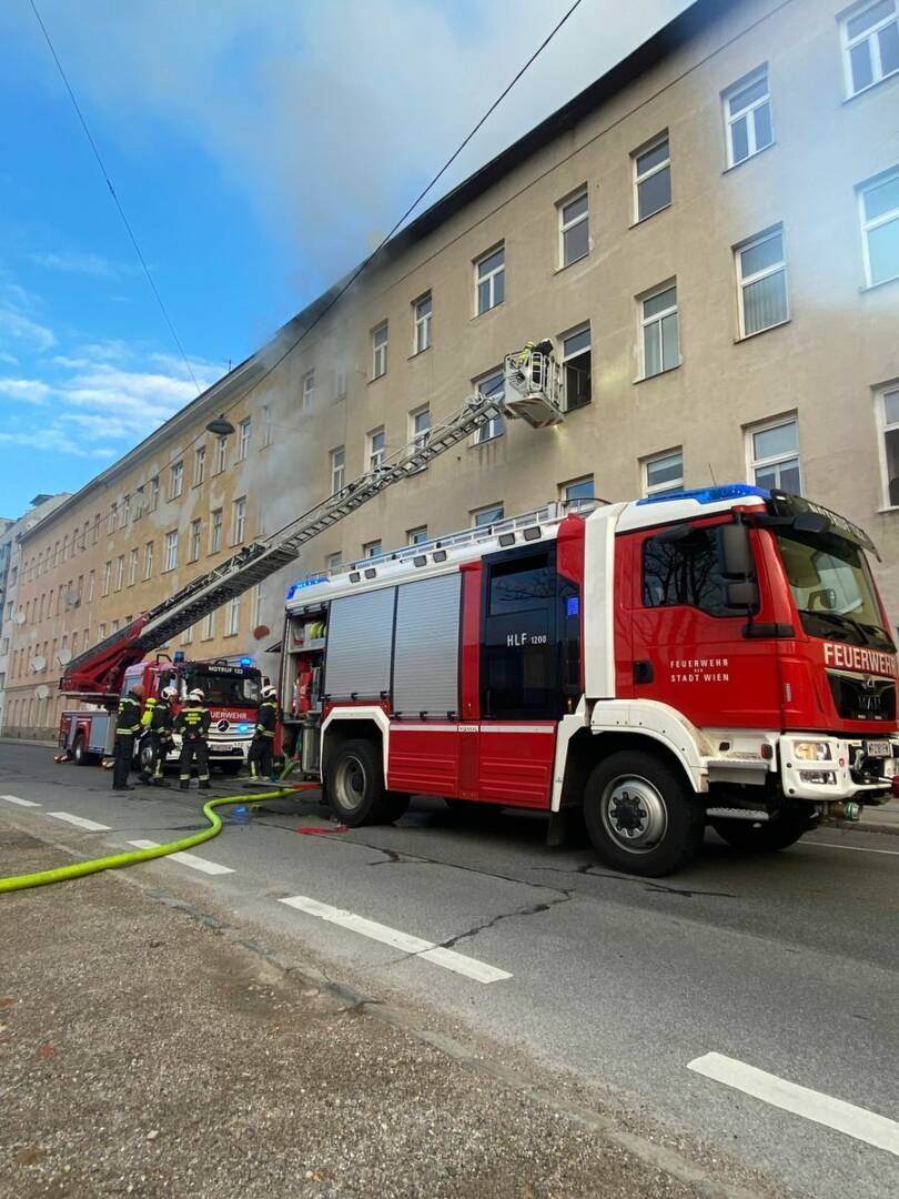 Bei einem Zimmerbrand in Wien – Brigittenau kann der Bewohner gerade noch selbst aus der Brandwohnung flüchten. Nachbarn sind in ihren Wohnungen vom Rauch eingeschlossen, einige von ihnen werden mittels Drehleiter in Sicherheit gebracht.