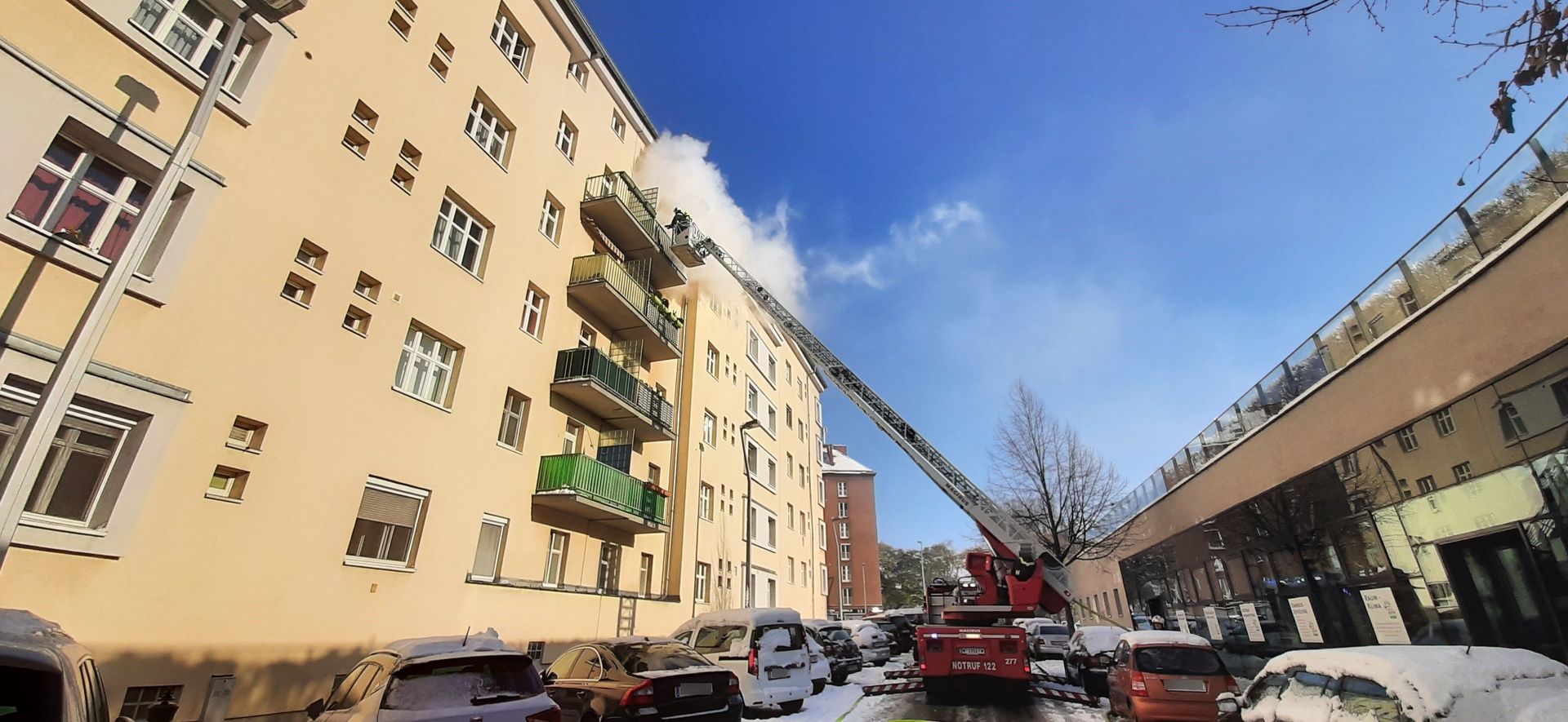 Beim Eintreffen der Berufsfeuerwehr Wien schlagen bereits Flammen aus der Balkontür einer Wohnung in der Engerthstraße. Unverzüglich wird mit der Brandbekämpfung, mit einer Löschleitung über die Drehleiter und einer weiteren Löschleitung unter Atemschutz über das Stiegenhaus begonnen. Zeitgleich kontrolliert ein Atemschutztrupp das teilweise verrauchte Stiegenhaus und findet die Bewohnerin, die sich selbst aus der Brandwohnung retten konnte. Sie wird ins Freie gebracht, dem Rettungsdienst übergeben und anschließend hospitalisiert.