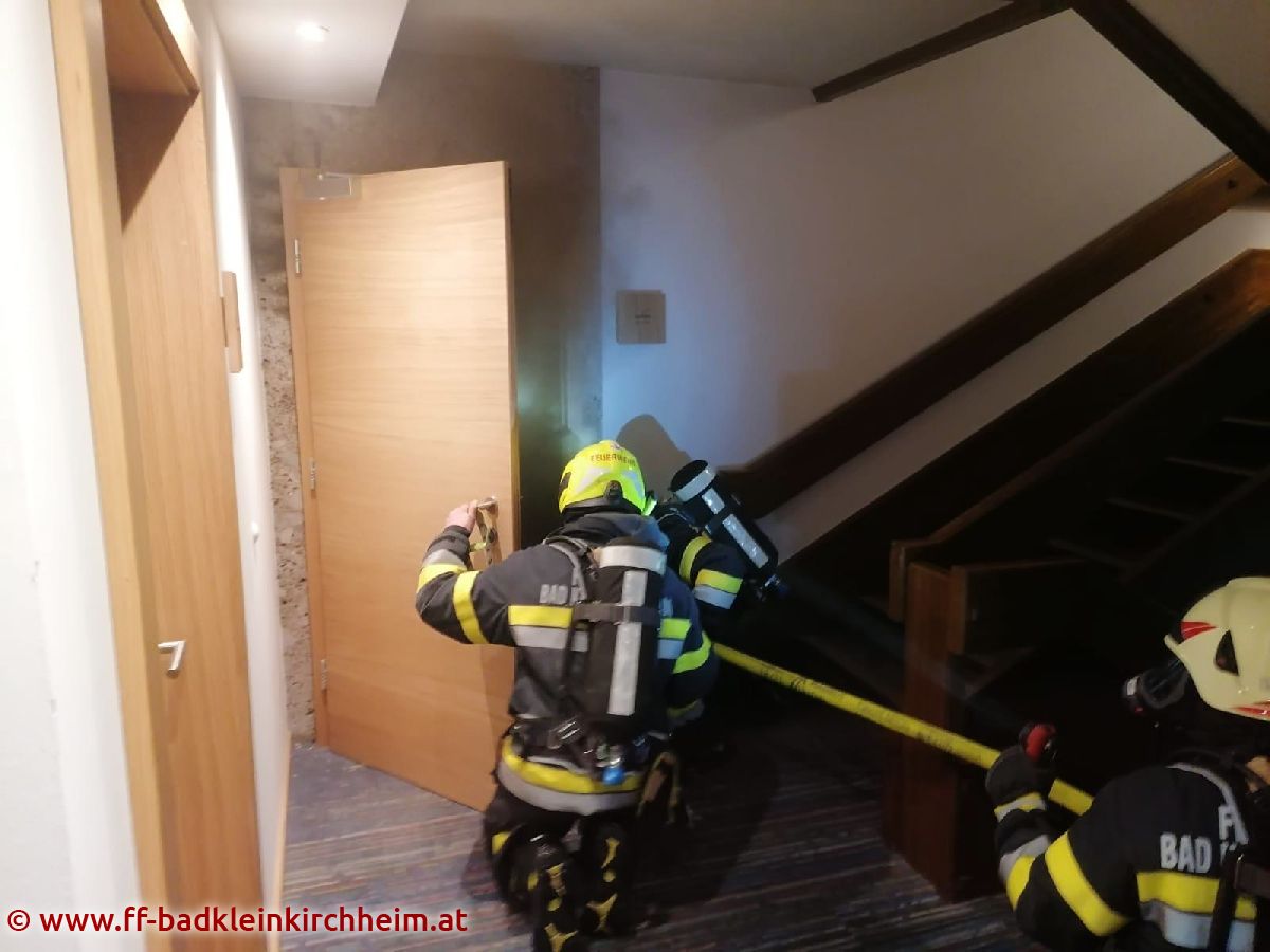 Bei Eintreffen der Feuerwehr war der vom Brand betroffene Gebäudeteil bereits vorbildlich vom Hotelpersonal evakuiert worden. Der Hotelbesitzer informierte den Einsatzleiter über die Schadenslage. Atemschutztrupp RLFA 3000 Bad Kleinkirchheim drang daraufhin mit einer Löschleitung über den nördlichen Eingang in die Wäscherei vor. Im Zuge der Türöffnung konnte festgestellt werden, dass der Brand bereits ventilationsgesteuert war. Nach einer ausgiebigen Rauchgaskühlung drang der Atemschutztrupp in den Brandraum vor und konnte den Brand rasch unter Kontrolle bringen. Atemschutztrupp KLFA Bad Kleinkirchheim übernahm in weiterer Folge die Entrauchungsmaßnahmen im Gebäude. Aufgrund der starken Rauchentwicklung wurden insgesamt drei Druckbelüfter eingesetzt.
