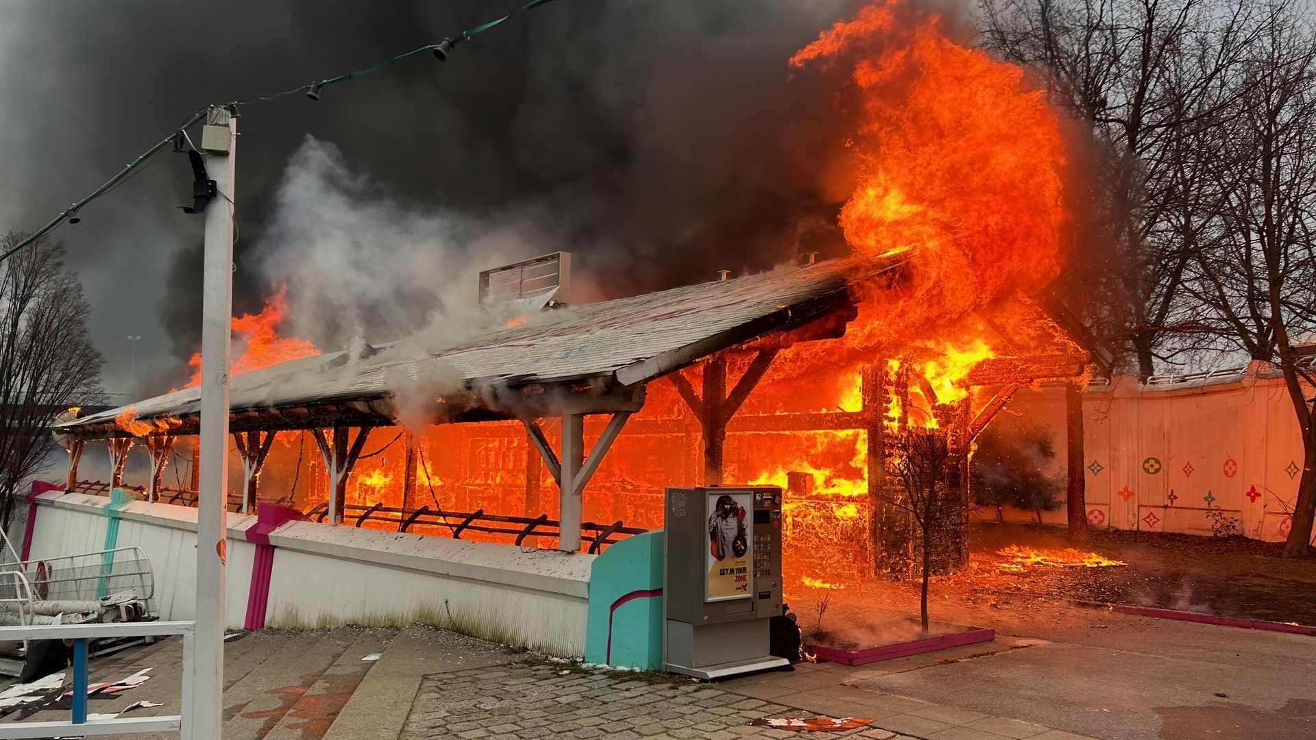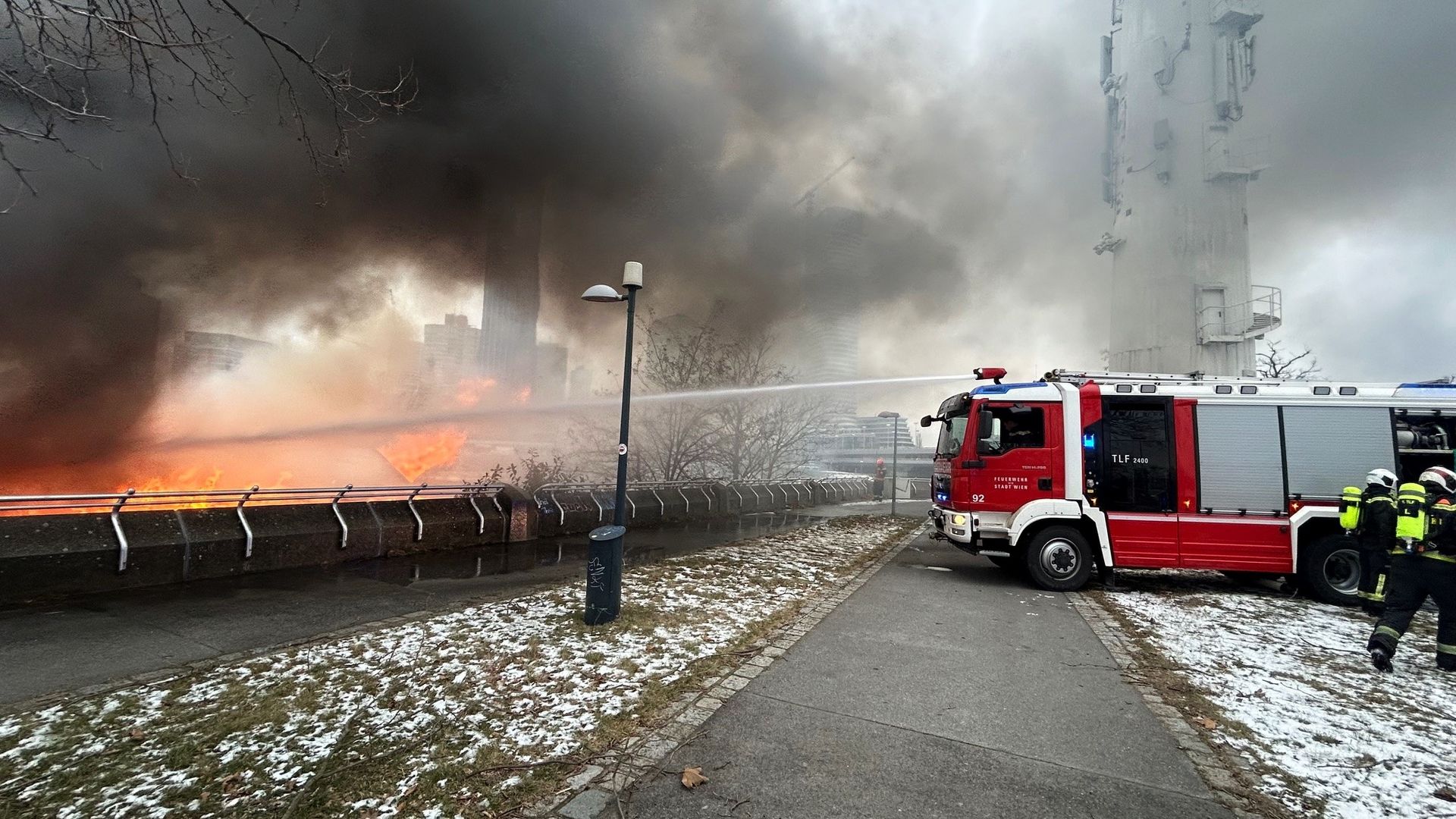 Ein Geschäftslokal auf der Donauinsel neben der Reichsbrücke steht in Vollbrand. Aufgrund der exponierten Lage langen zahlreiche Anzeigen in der Notrufzentrale der Berufsfeuerwehr Wien ein, die Feuerwehr rückt sofort mit einer Löschbereitschaft aus.