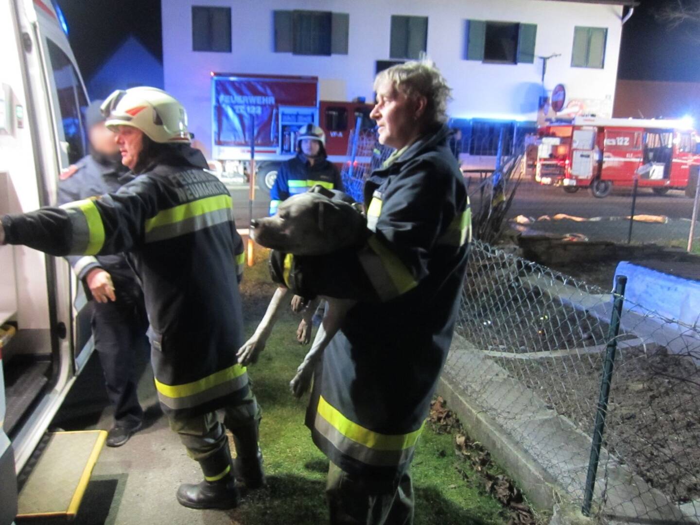 Die Feuerwehr Neumarkt an der Raab sorgte für die Wasserversorgung über einen nahegelegenen Hydranten. Im Zuge der Löschmaßnahmen wurde festgestellt, dass sich der Hund des Hausbesitzers noch im einem Zimmer befindet. „Mia“ – so der Name des American Stafford – wurde in weitere Folge aus dem verrauchten Nebenzimmer gerettet und ist wieder wohlauf.