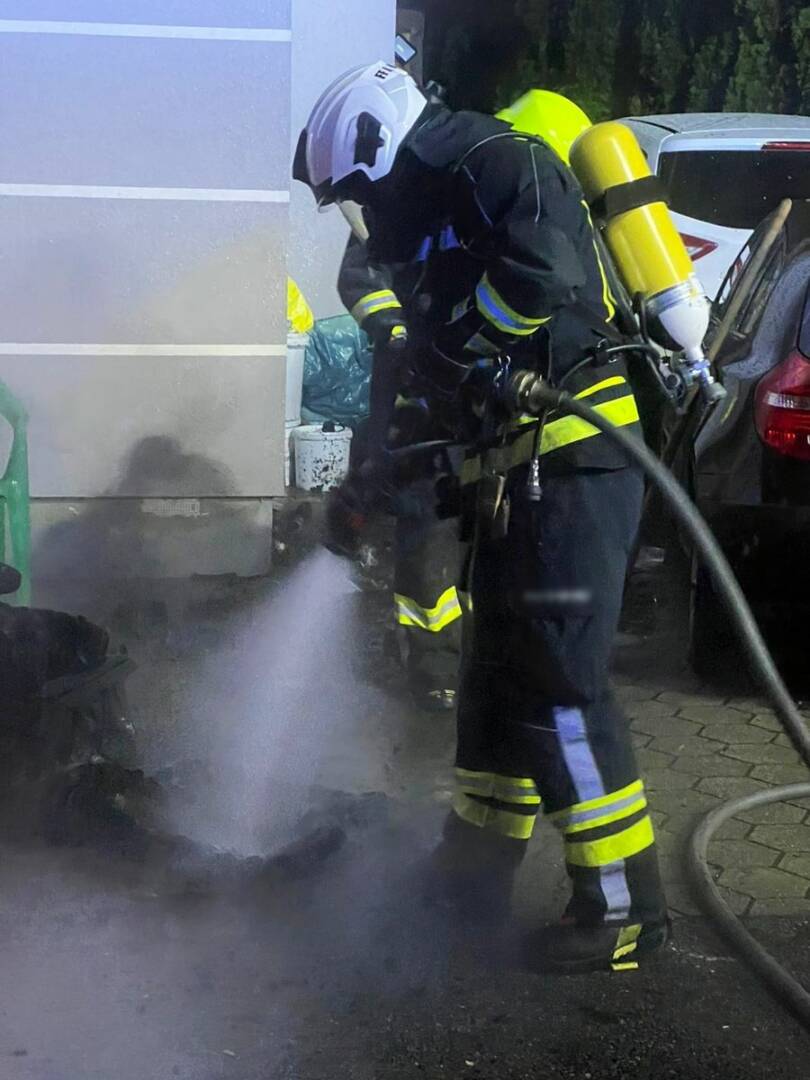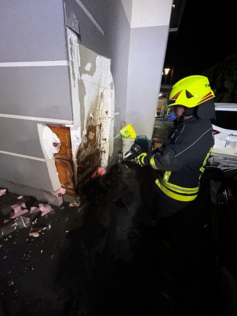 Die Feuerwehr Andorf war innerhalb weniger Minuten mit ca. 30 Einsatzkräften vor Ort und bekämpfte den Brand unter schwerem Atemschutz. Durch das schnelle Handeln konnte ein Übergreifen auf die Holzriegelstruktur verhindert werden und der Brand beschränkte sich auf die Fassade des Hauses. Diese wurde mittels Wärmebildkamera auf weitere Glutnester abgesucht, entsprechend geöffnet und abgelöscht. Die drei weiteren alarmierten Feuerwehren mussten nicht mehr eingreifen.