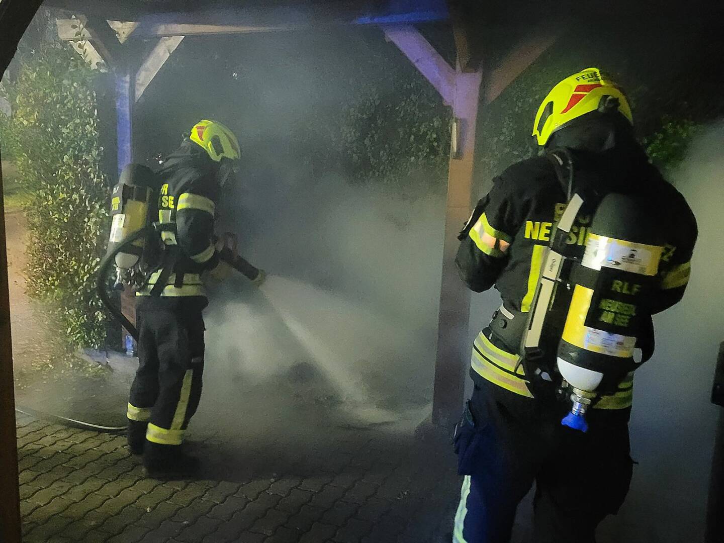 Die Eigentümer bemerkten den Brand nicht und wurden von der Feuerwehr informiert. Dank der Alarmierung einer aufmerksamen Passantin und dem raschen Einschreiten der Feuerwehr konnte ein Übergreifen des Brandes auf das Carport und die angrenzende Hecke verhindert werden.