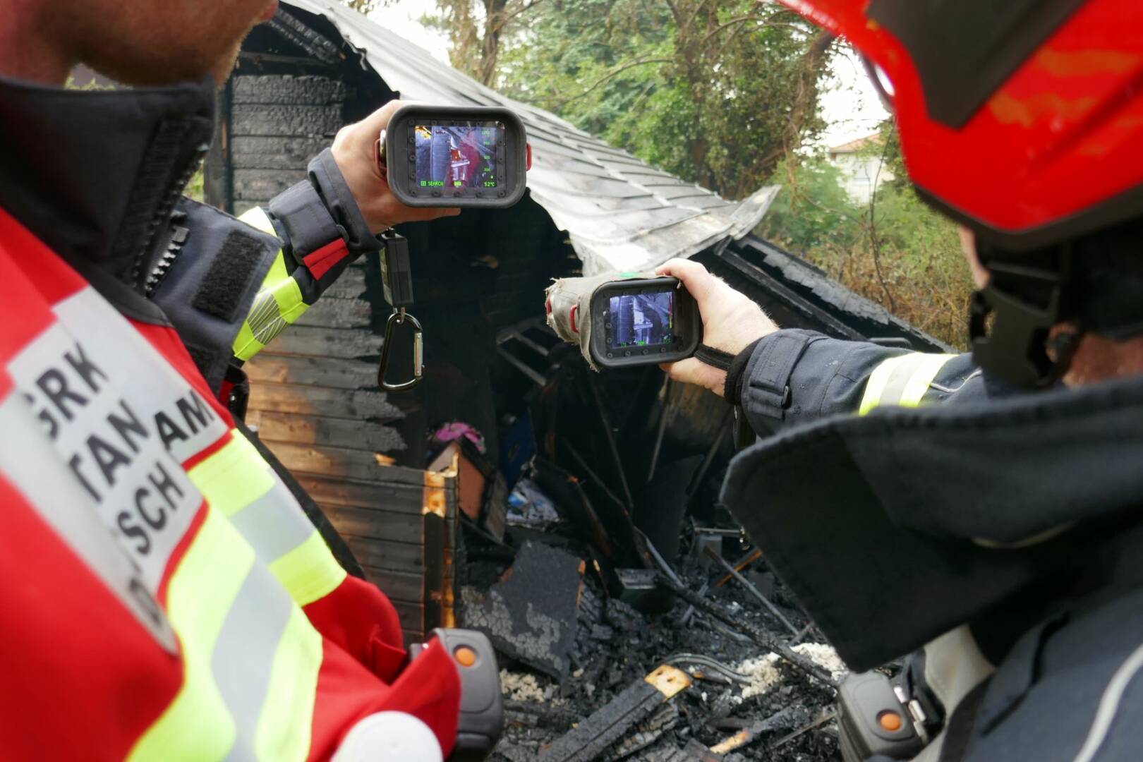 Um alle Glutnester ablöschen zu können, musste die Blechdachkonstruktion der während den Löscharbeiten eingestürzten Hütte vollständig geöffnet, entfernt und die freigelegte Fläche mittels Wärmebildkamera kontrolliert werden.