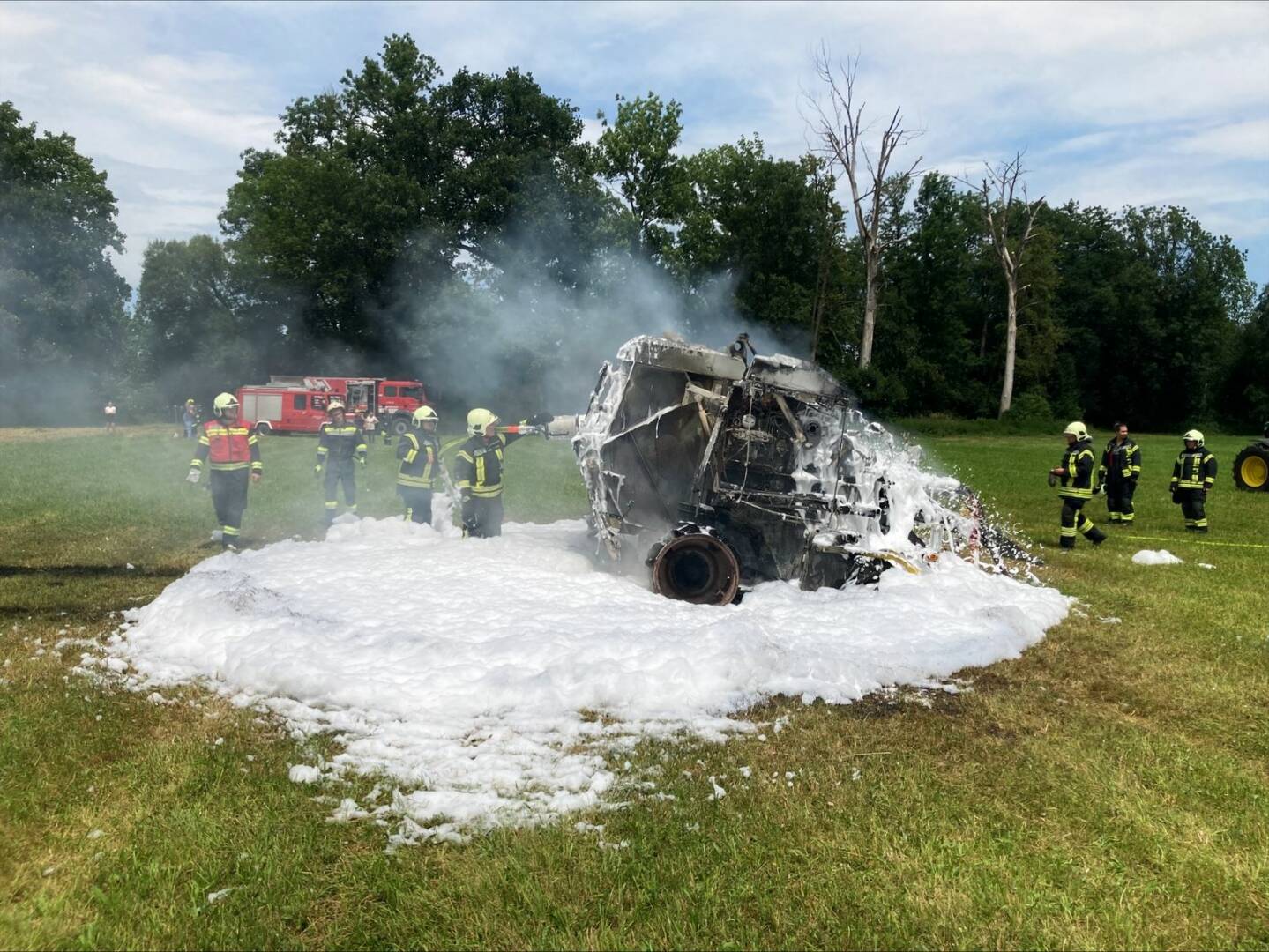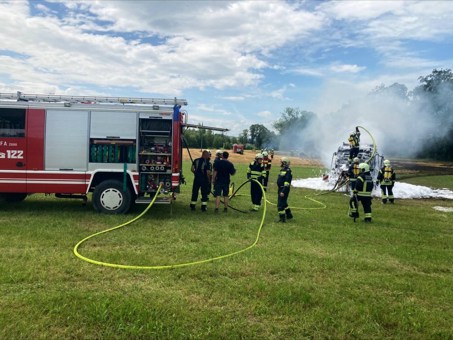 Die Feuerwehrmänner rüsteten sich mit umluftunabhängigen Atemschutzgeräten aus und bekämpften den Pressenbrand mit Wasser und Schaummittel. Das windstille Wetter war von Vorteil, da sich das Feuer am Feld nicht so schnell ausbreiten konnte. Geistesgegenwärtig fuhr der Fahrer vom Strohfeld auf eine Wiese, wo er den Traktor noch rechtzeitig von der Presse abkuppeln konnte. Der Traktor erlitt aufgrund der Hitzeeinwirkung Beschädigungen im Heckbereich. Die Presse wurde ein Raub der Flammen.