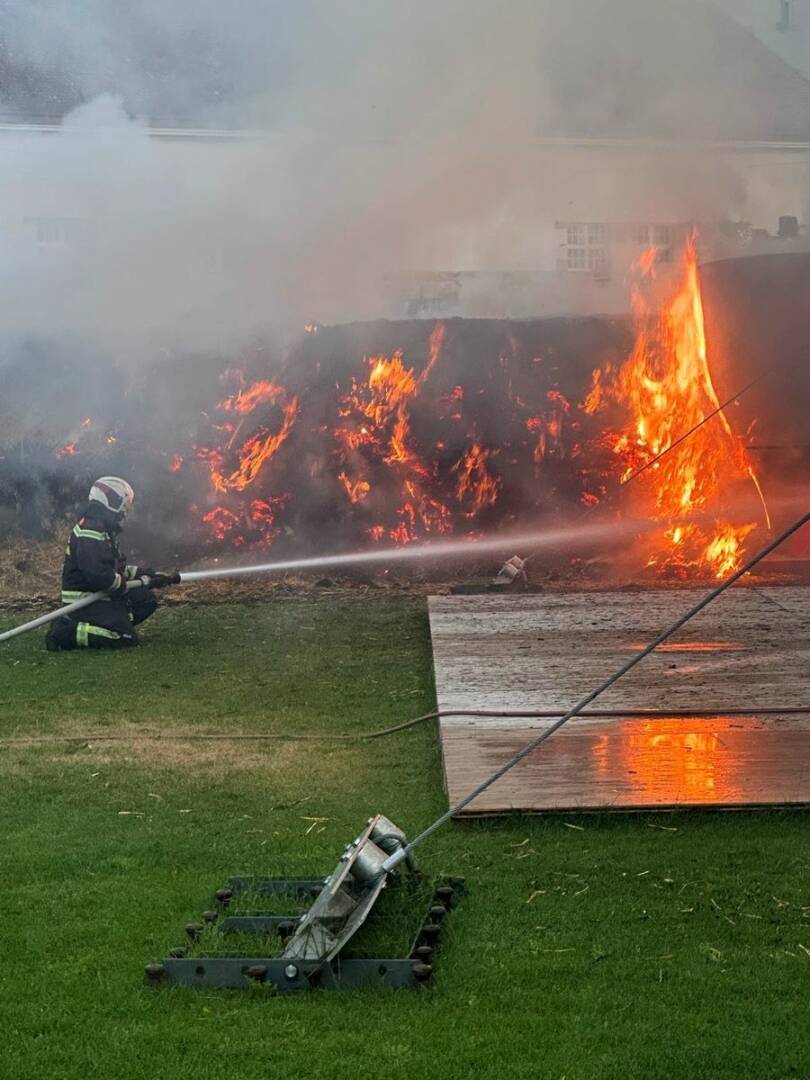 Für die Brandbekämpfung waren zeitweise 8 Einsatzfahrzeuge und 7 Löschleitungen gleichzeitig im Einsatz. Hinzu kommen Sonderfahrzeuge für Nachschub bzw. zur technischen Unterstützung der Brandbekämpfungs- und Nachlöscharbeiten. Um die Stroh(-Rund-)ballen ablöschen zu können, mussten diese mittels Baggerlader zerteilt werden.