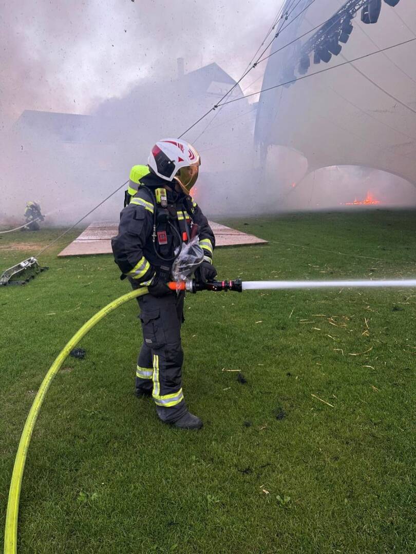 Mit sieben Löschleitungen bekämpfen Feuerwehrleute, teilweise unter Atemschutz, den Brand einer nicht öffentlichen Eventlocation auf einem Firmenareal. Die Brandbekämpfung und Nachlöscharbeiten dauerten bis in die Morgenstunden. Es wurde niemand verletzt.