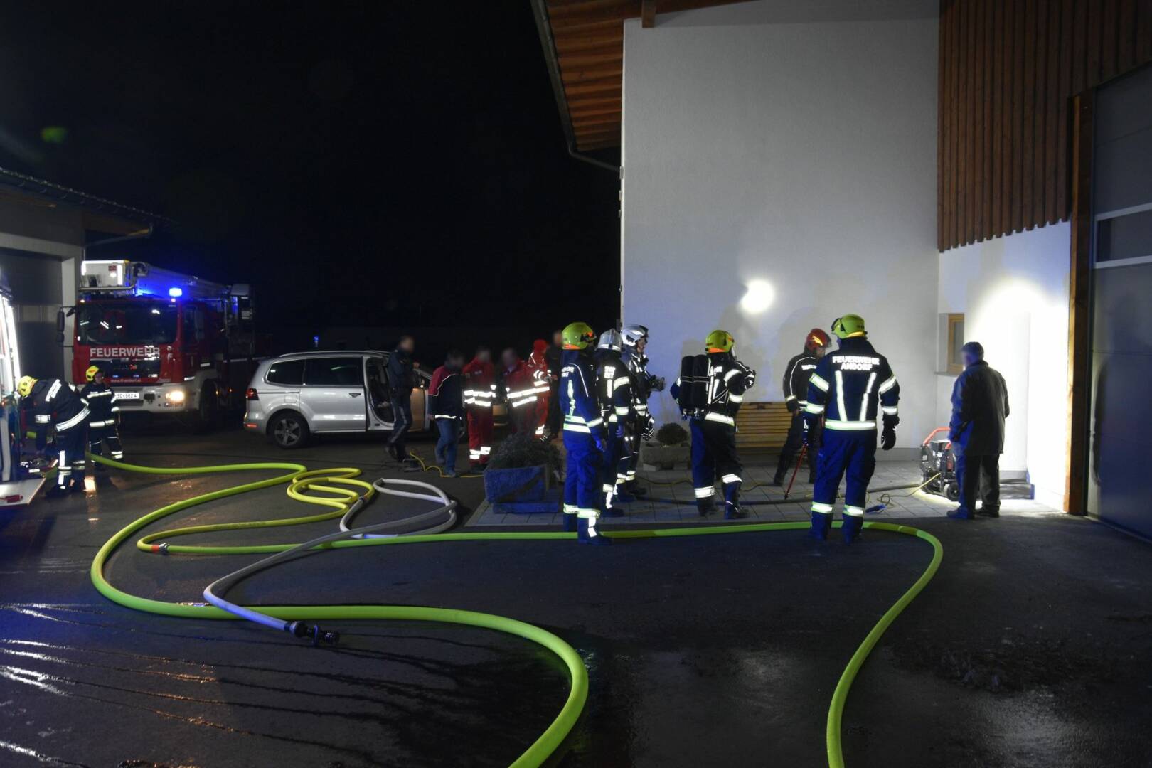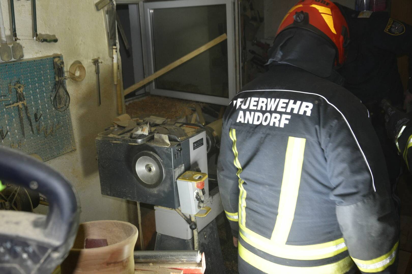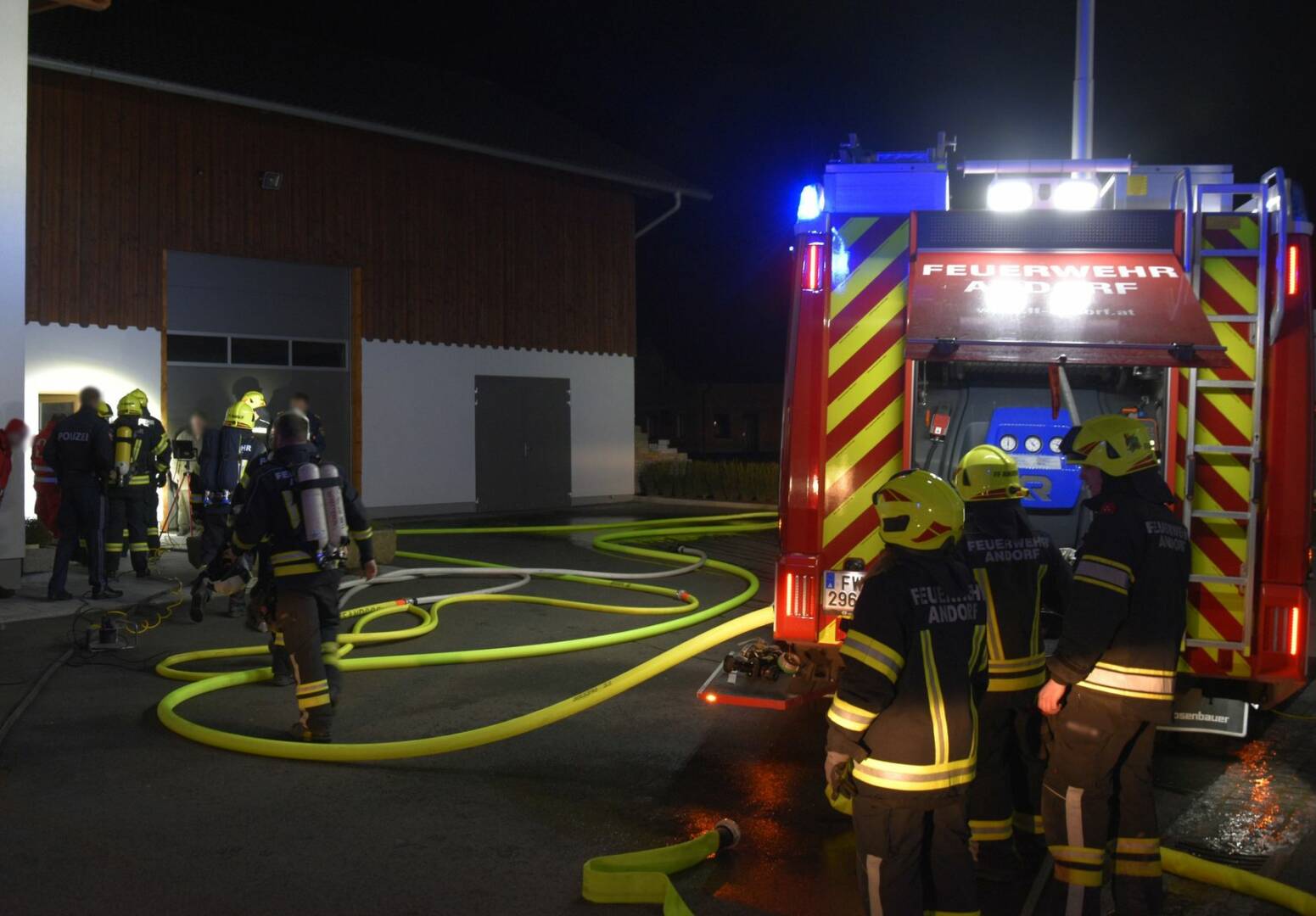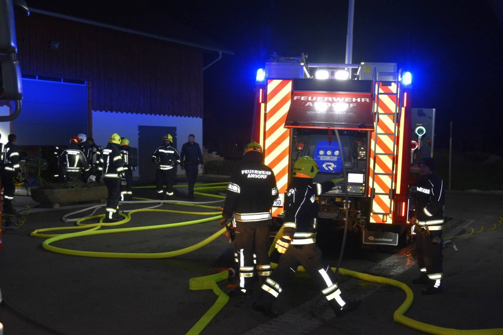 Die Einsatzkräfte der Feuerwehr Andorf, die sich wegen der Vorbereitung auf eine Leistungsprüfung glücklicherweise noch zahlreich im Feuerwehrhaus befanden, waren nur wenige Minuten nach der Alarmierung durch die Landeswarnzentrale am Einsatzort, wodurch Schlimmeres verhindert werden konnte. Noch während der Anfahrt rüstete man sich mit Atemschutzgeräten aus und konnte so nach Eintreffen am Einsatzort sofort mit einem Hochdruckstrahlrohr mit der Brandbekämpfung in der Werkstatt beginnen.