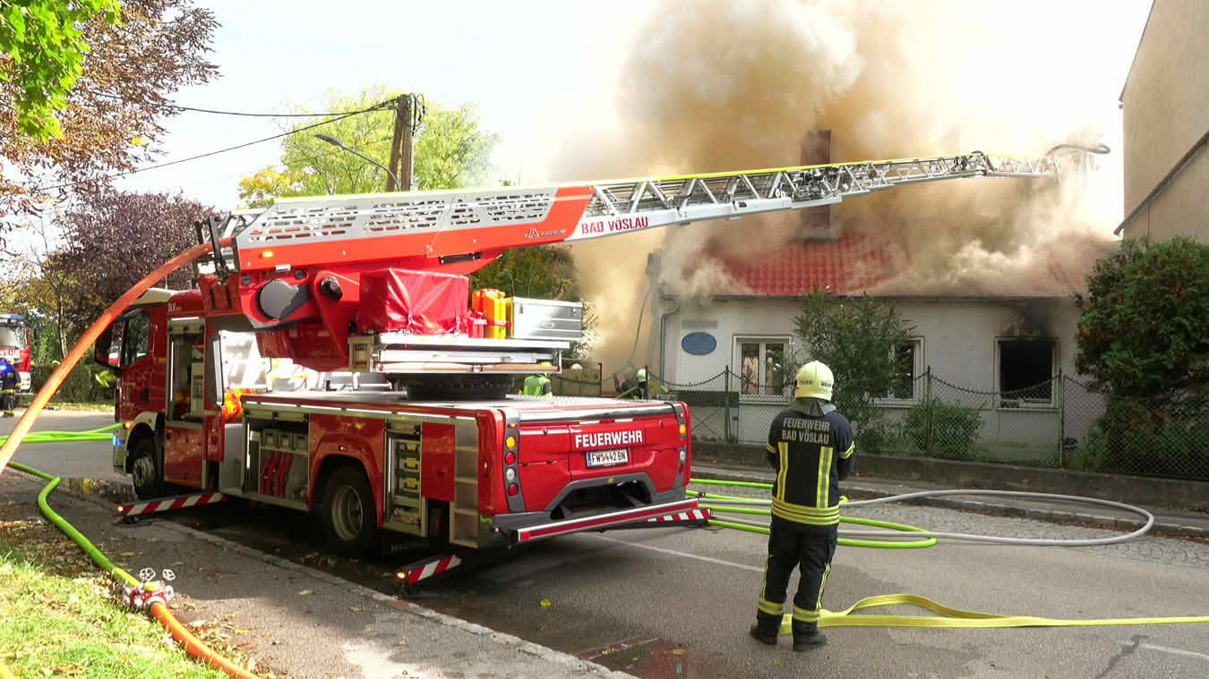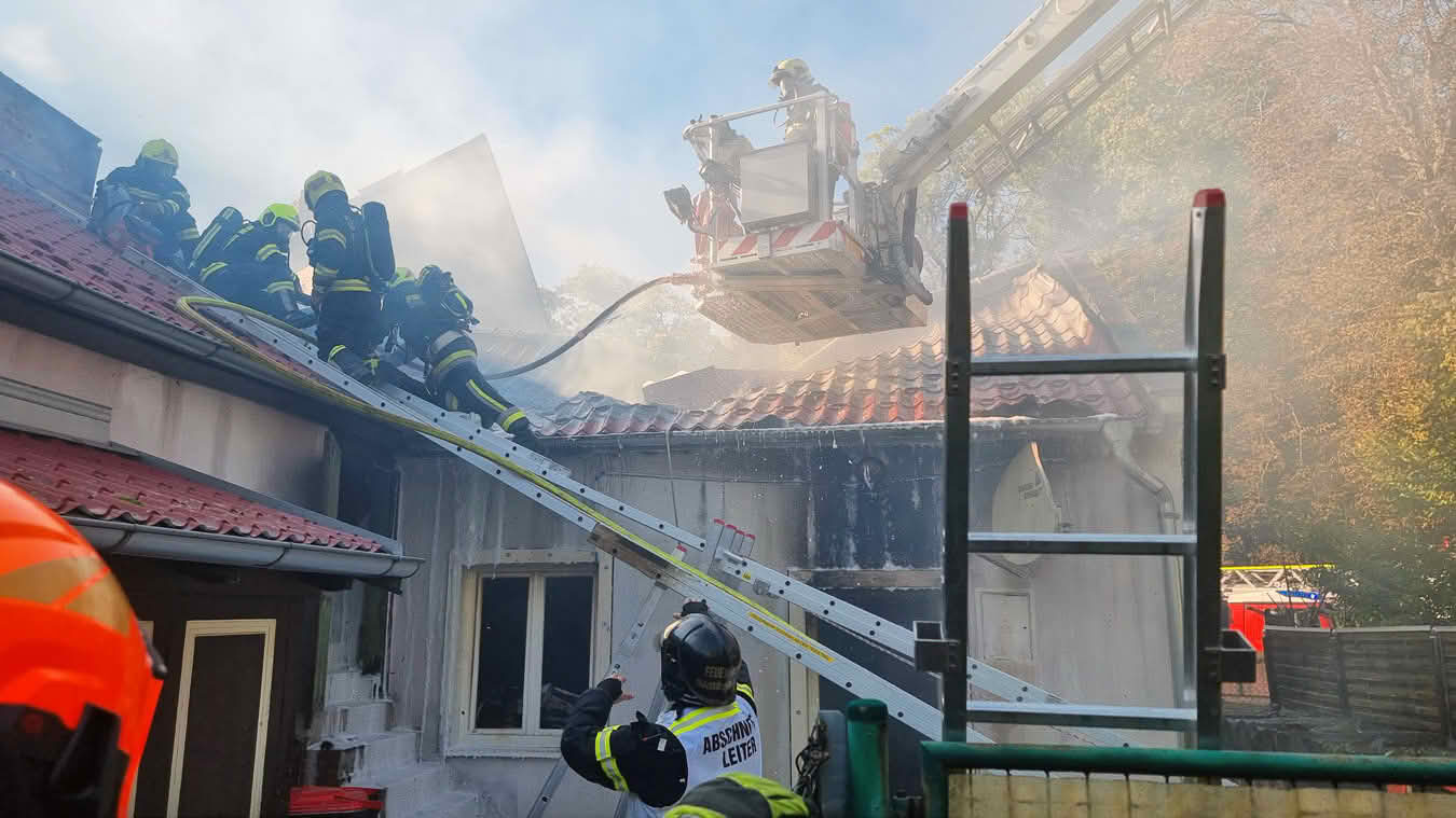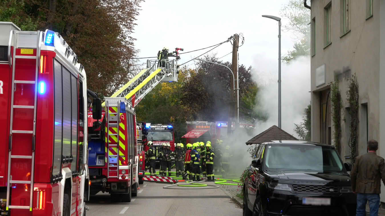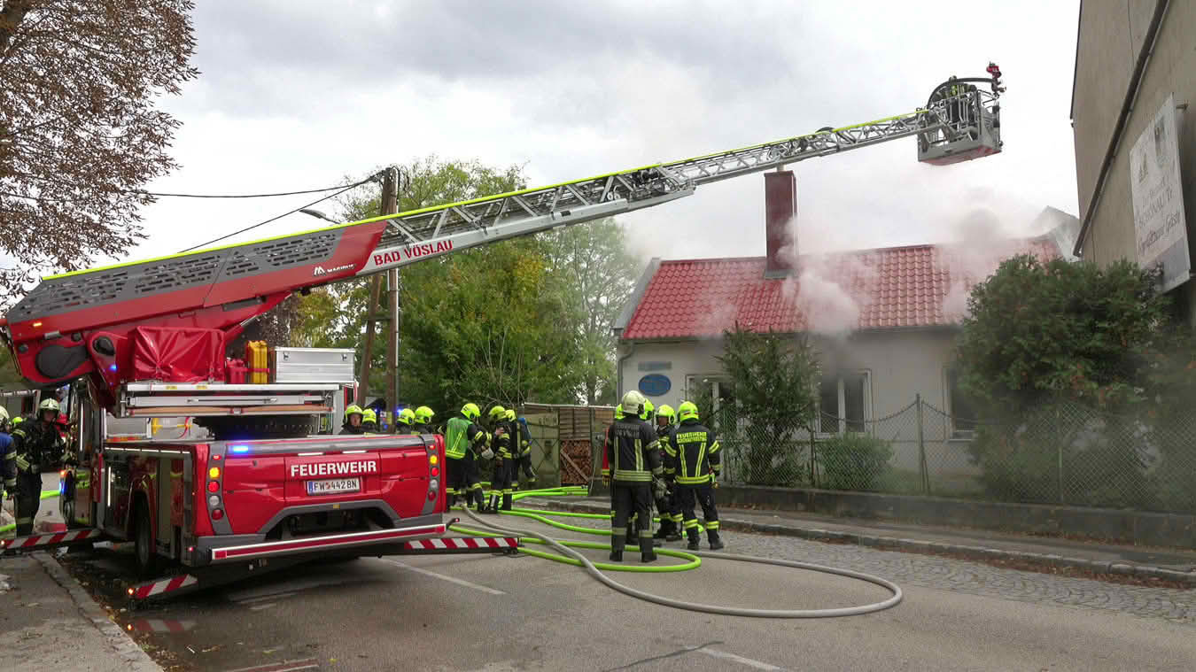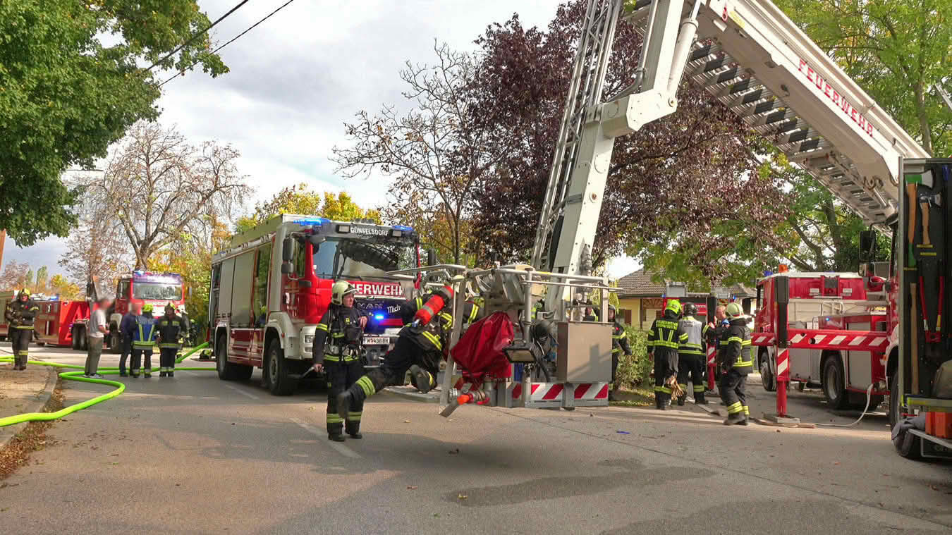 Da sich der Brand im Erdgeschoß dann im weiteren Verlauf auch auf das Dach ausbreiten konnte und plötzlich Flammen aus dem Dachgiebel drangen, wurde ein zweites Hubrettungsgerät – FF Traiskirchen Stadt mit der Teleskopmastbühne und in Folge noch weitere Feuerwehren mit Atemschutzgeräteträgern (FF Leobersdorf; FF Blumau, FF Sooß) zur Unterstützung nachalarmiert.