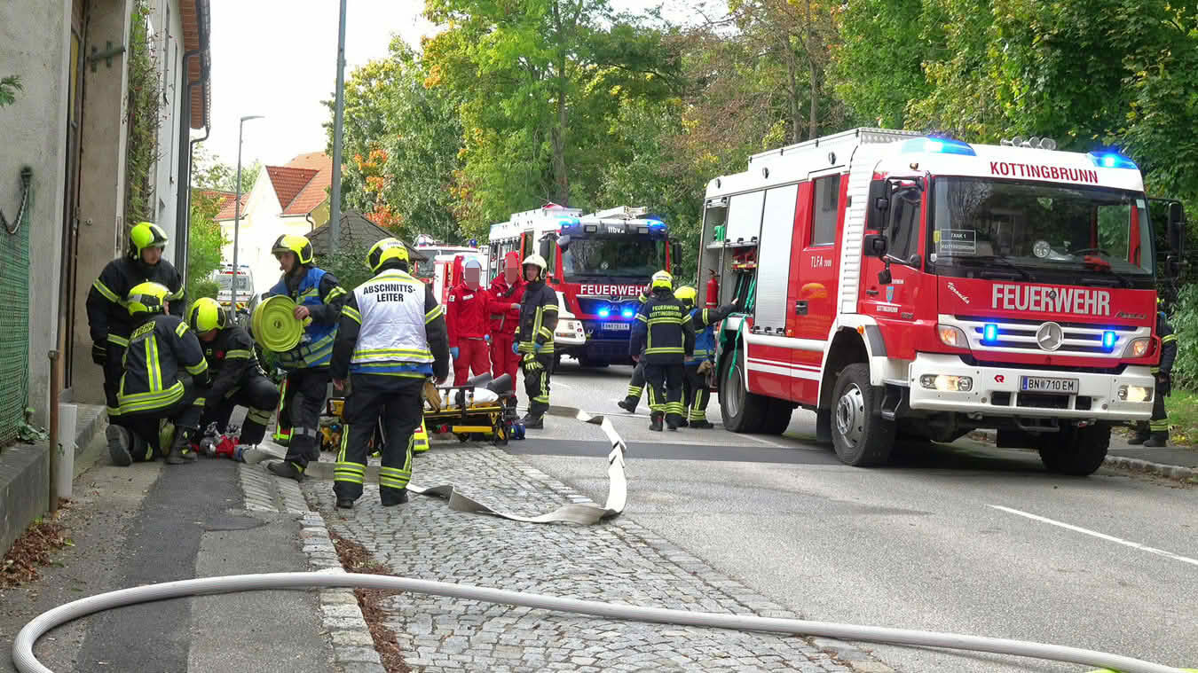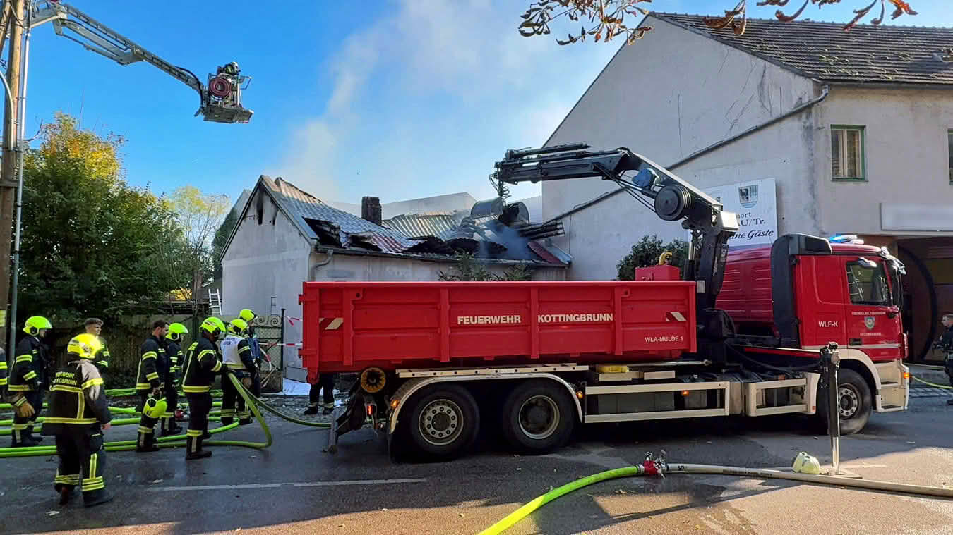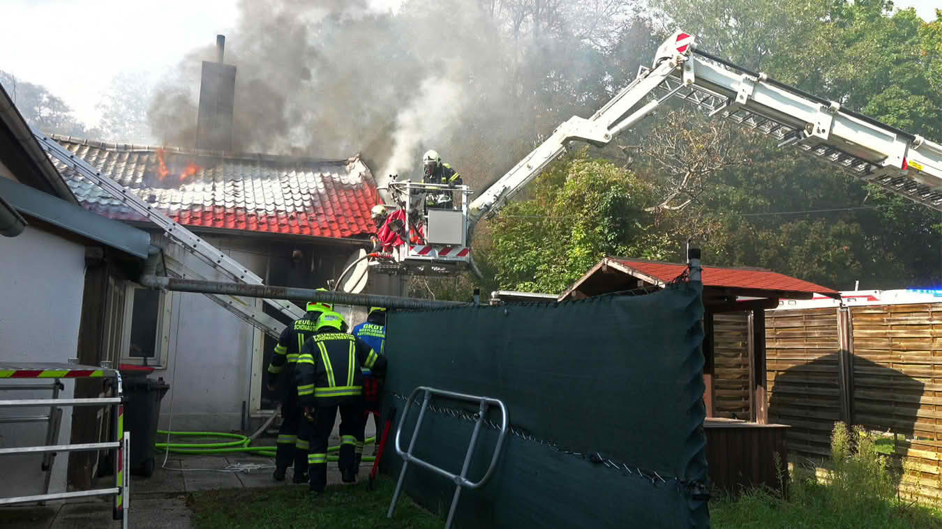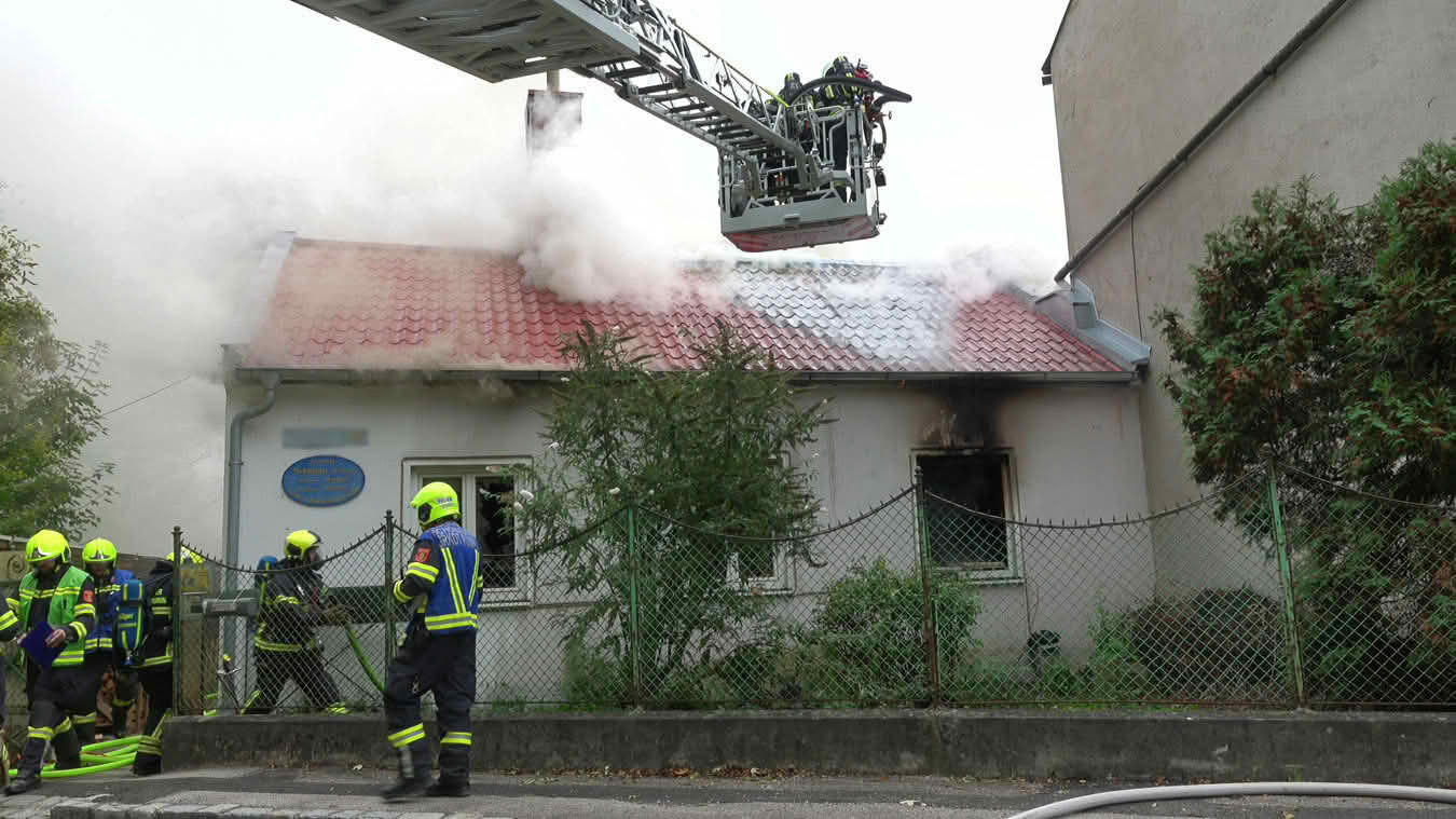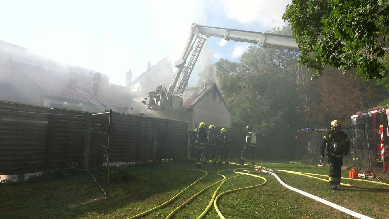 Da sich der Brand im Erdgeschoß dann im weiteren Verlauf auch auf das Dach ausbreiten konnte und plötzlich Flammen aus dem Dachgiebel drangen, wurde ein zweites Hubrettungsgerät – FF Traiskirchen Stadt mit der Teleskopmastbühne und in Folge noch weitere Feuerwehren mit Atemschutzgeräteträgern (FF Leobersdorf; FF Blumau, FF Sooß) zur Unterstützung nachalarmiert.