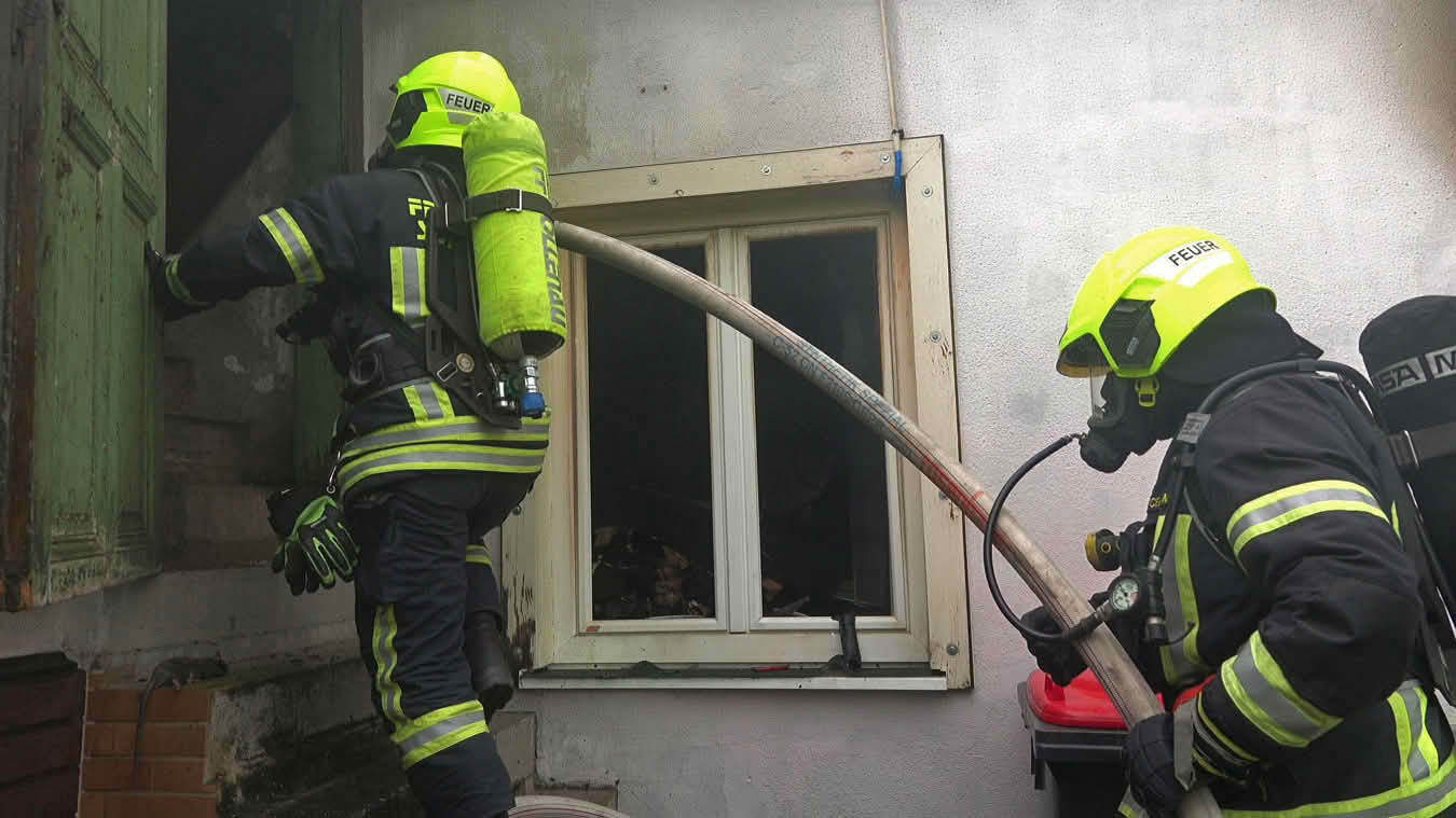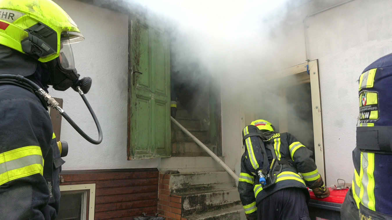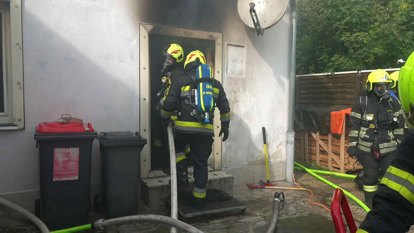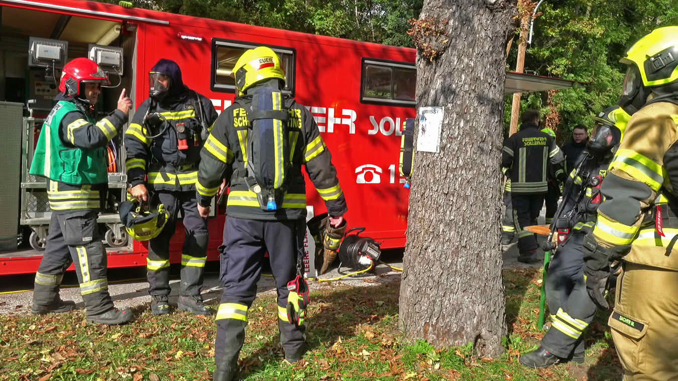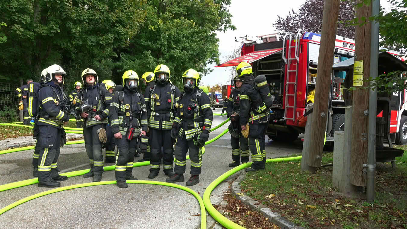 Da sich der Brand im Erdgeschoß dann im weiteren Verlauf auch auf das Dach ausbreiten konnte und plötzlich Flammen aus dem Dachgiebel drangen, wurde ein zweites Hubrettungsgerät – FF Traiskirchen Stadt mit der Teleskopmastbühne und in Folge noch weitere Feuerwehren mit Atemschutzgeräteträgern (FF Leobersdorf; FF Blumau, FF Sooß) zur Unterstützung nachalarmiert.