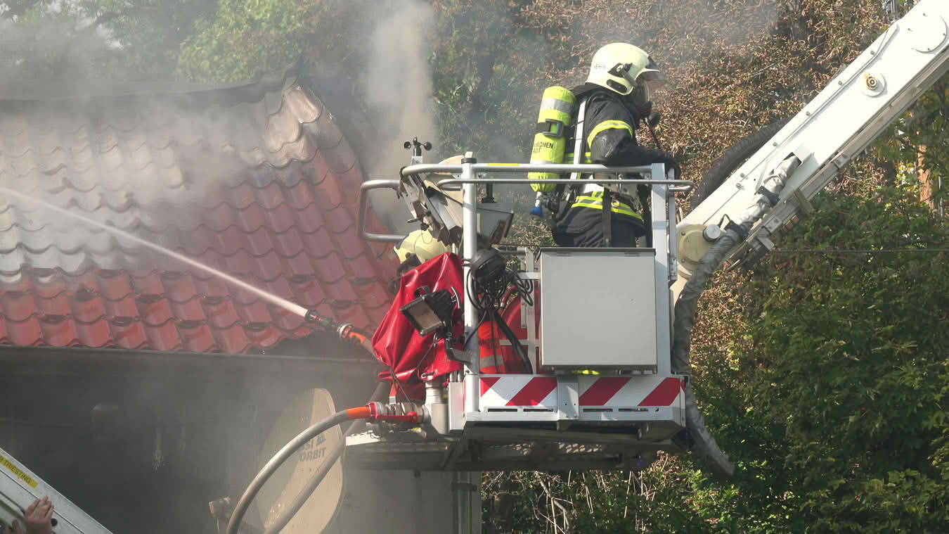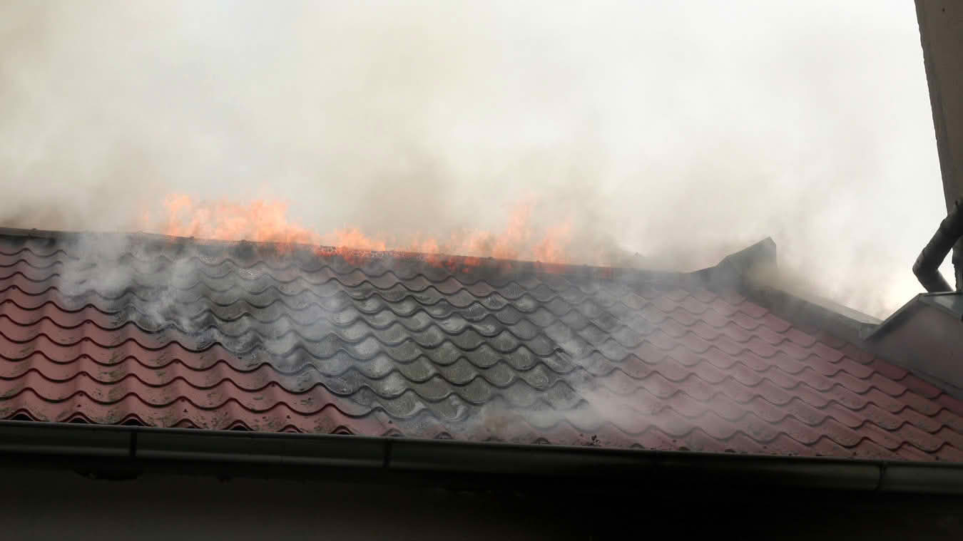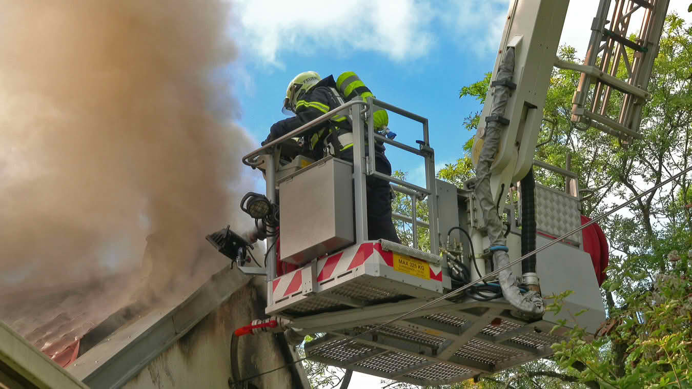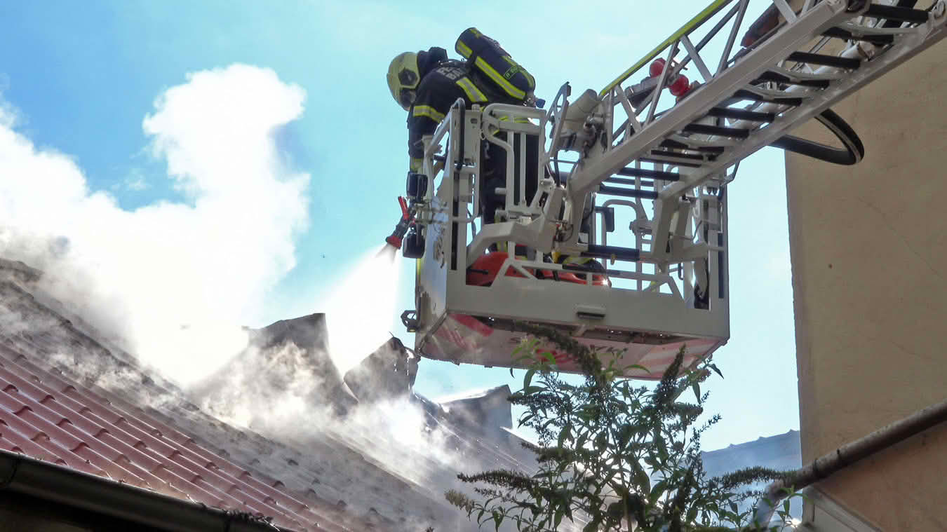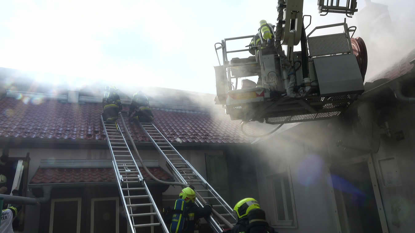 Die Schwierigkeit dabei war jedoch ins Innere des betroffenen Dachstuhls vorzudringen, da die Dachdeckung nicht aus herkömmlichen Dachziegeln bestand, sondern aus Metall-Platten in Ziegeloptik. Da diese mehrmals verschraubt waren, mussten zum Öffnen der Dachhaut Motortrennjäger und andere Brech- bzw. Schneidwerkzeuge eingesetzt werden.