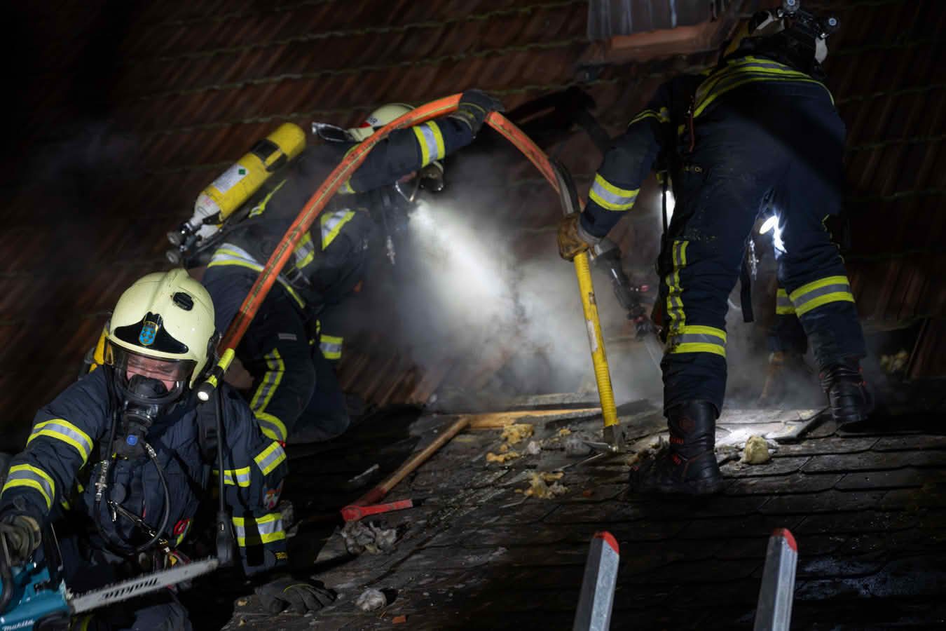 Währenddessen setzten die Feuerwehrkräfte die Brandbekämpfung fort. Mit Hilfe einer Wärmebildkamera wurden letzte Glutnester im Gebälk des Dachstuhls lokalisiert. Um diese vollständig ablöschen zu können, musste die Dachdeckung teilweise entfernt werden.