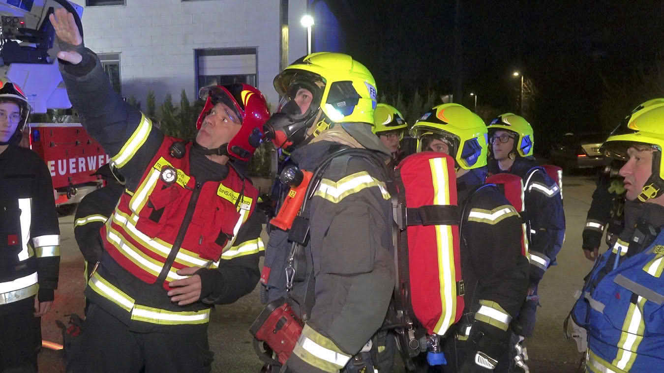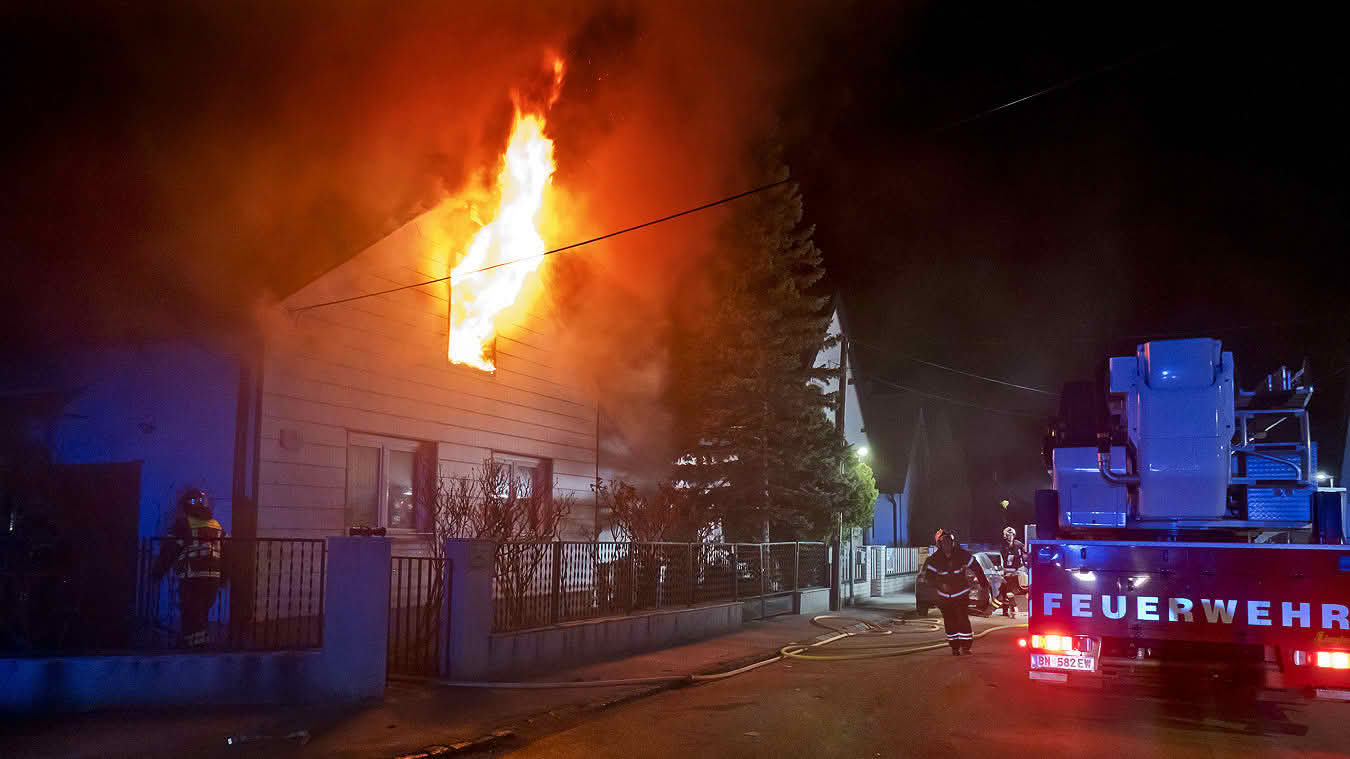 Bei Eintreffen der ersten Feuerwehreinsatzkräfte schlugen meterhohe Flammen aus einem Fenster im Dachgeschoß des Hauses. Der betroffene Raum stand da bereits in Vollbrand. Glücklicherweise konnte sich das ältere Ehepaar ins Freie retten. Da sich keine weiteren Personen im Gebäude befanden, ließ Feuerwehreinsatzleiter Kommandant Oliver Stocker sofort eine C-Löschleitung unter Atemschutz im Innenangriff vornehmen und die Teleskopmastbühne direkt vor dem Haus in Stellung bringen. Denn es bestand die Gefahr, dass sich die Flammen auch auf das Dach ausbreiten.