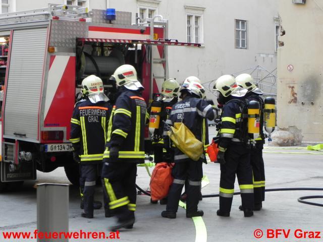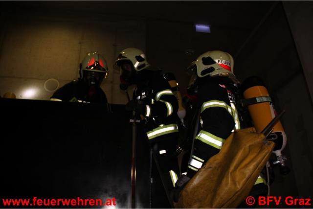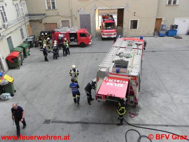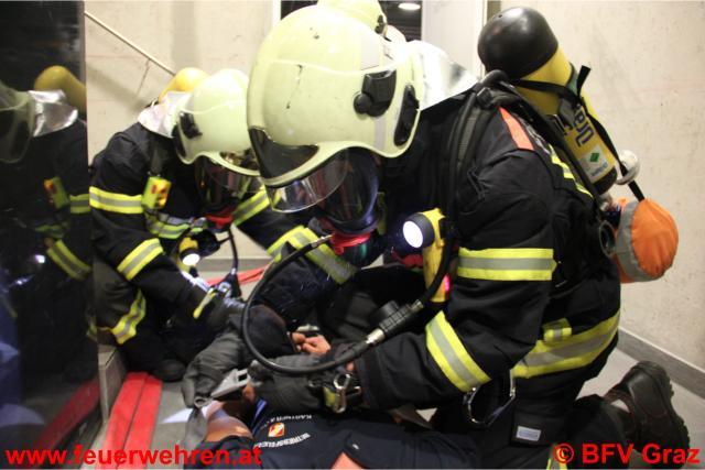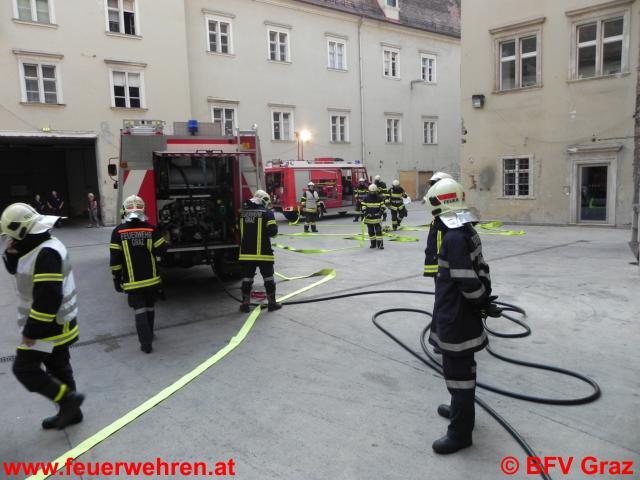 Die Übungsannahme war eine starke Rauchentwicklung in der Warenmanipulation von Kastner & Öhler mit mehreren verletzten Personen. Nach der Erkundung der Betriebsfeuerwehr vor Ort wurde festgestellt, dass ein Einsatz mit Atemschutzgeräten erforderlich ist. Daraufhin wurden die FF Graz sowie die FF Zwaring-Pöls, die ebenfalls an der Übung teilnahm, alarmiert. Nach dem Eintreffen der drei Einsatzfahrzeuge im Admonterhof wurde umgehend mit der Menschenrettung und Brandbekämpfung begonnen. Dazu machten sich zwei Atemschutztrupps der FF Graz und ein Trupp der FF Zwaring-Pöls auf den Weg in das verrauchte Gebäude. Die Einsatzleitung übernahm der stellvertretende Kommandant der Betriebsfeuerwehr, OBI Robert Ortner, der gemeinsam mit HBI Andreas Rieger, Kommandant der FF Graz diese Übung organisierte.