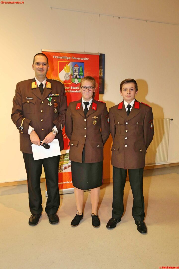 Ein erster Höhepunkt der Wehrversammlung war die Angelobung zweier Jungkameraden. Nach dem Vorlesen der Gelöbnisformel durch den Kommandanten bestätigten FM Annika Eckart und PFM Florian Gollob ihren Treueeid mit einem kräftigen „Ich gelobe“ und wurden unter dem Applaus aller Anwesenden in den Aktivstand der Freiwilligen Feuerwehr Deutschlandsberg überstellt. Als weitere Beförderungen des Abends standen auf dem Programm: