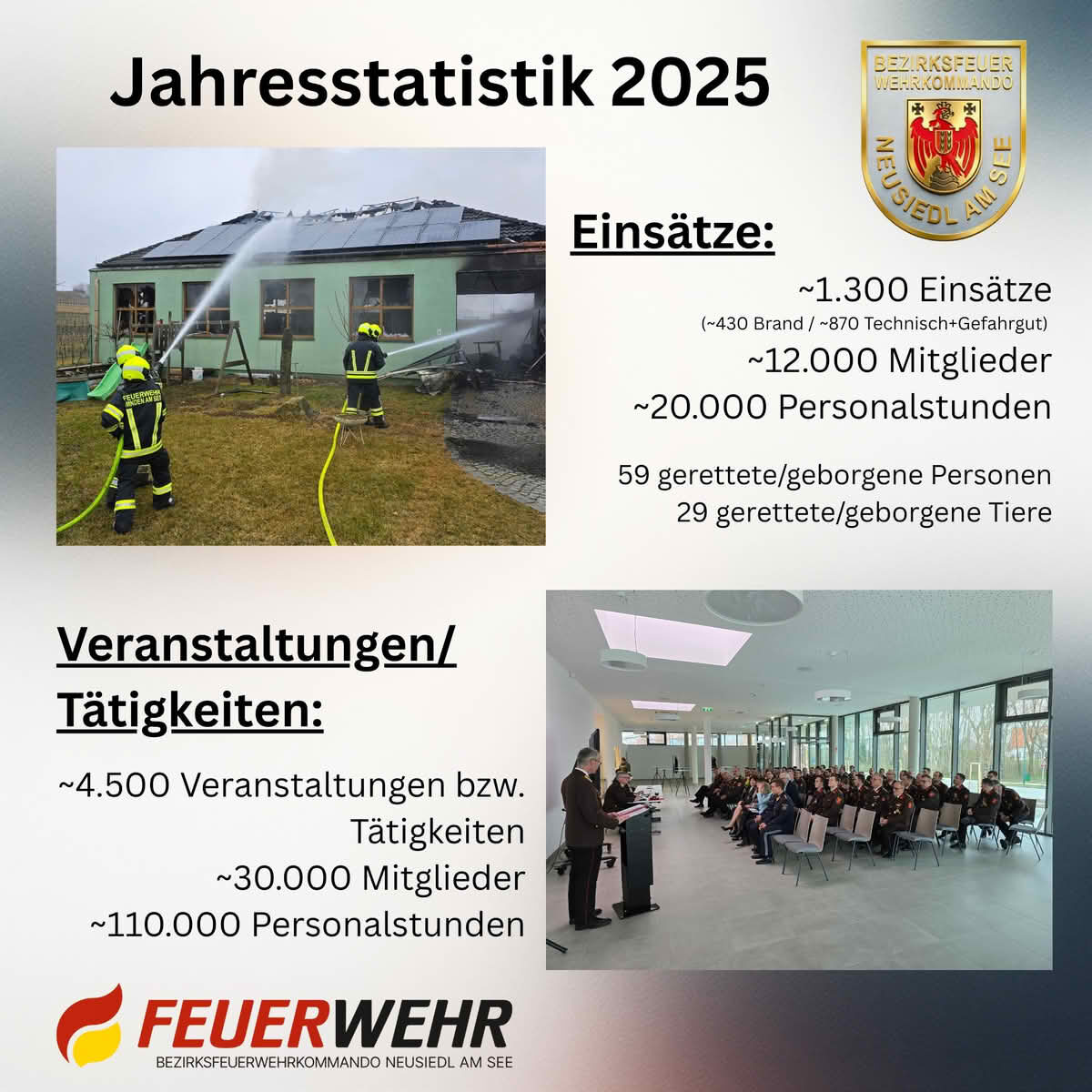 Diese beeindruckende Jahresstatistik des Bezirkes Neusiedl am See spiegelt das tief verwurzelte leidenschaftliche Engagement, die gelebte Kameradschaft und die freiwillige und ehrenamtliche Bereitschaft der Mitglieder zum Dienst am Nächsten wider.