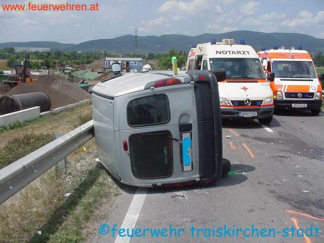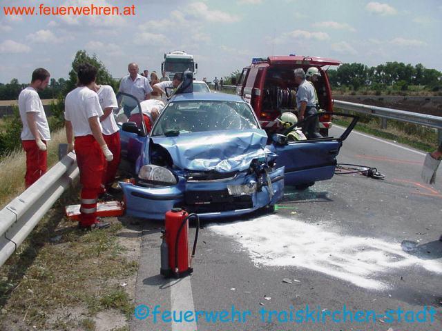 Am Freitag, 27.6.2003 gegen 12:46 Uhr wurde die Feuerwehr Traiskirchen Stadt zu einem Verkehrsunfall auf die Trumauer Strasse alarmiert. Rüst, Voraus und Tank Traiskirchen mit 13 Mann machten sich wenig später auf den Weg zum Einsatzort. Kurz vor der Unfallstelle wurde Einsatzleiter OBI Siegfried Stadler darüber informiert, dass sich noch eine Person in einem der Fahrzeuge befindet und das andere Fahrzeug zu brennen begonnen hatte.