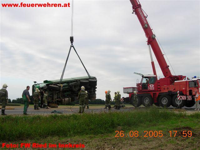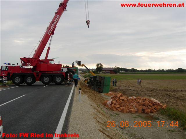 Die Feuerwehren Moosham, Katzenberg und Ried i.I. waren am 26.August 2005 bei einem LKW Unfall auf der B 148 im Gemeindegebiet Geinberg, Ortschaftsbereich Moosham im Einsatz. Ein mit Ziegeln beladener LKW Zug kam bei einem Ausweichmanöver rechts von der Fahrbahn ab und stürzte seitlich über die 2 Meter hohe Böschung. Der Lenker des LKW Zuges blieb bei dem Unfall unverletzt.