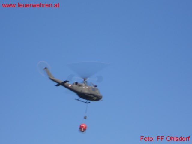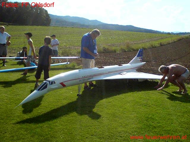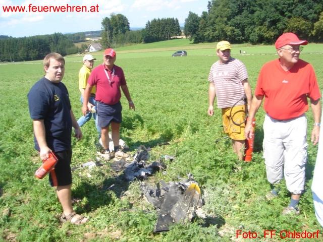 Der wohl außergewöhnlichste Einsatz der Ohlsdorfer Wehr stand am frühen Nachmittag auf dem Programm. Nach dem Start eines Modelldüsenjets verlor der Pilot die Kontrolle über die Maschine und stürzte ca. 150 Meter nach der Startbahn in ein Feld. 3 Liter Kerosin entzündete sich an der heißen Düse und der Jet ging in Flammen auf. 2 Kameraden sahen die Rauchwolke und fuhren sofort auf das Feld. Das Flugfeldperonal war bereits mit zwei Feuerlöschern an der Absturzstelle eingetroffen und so mussten die Ohlsdorfer Feurwehrmänner nur mehr Sicherungs- und Aufräumungsarbeiten durchführen. Der Düsenjet brannte vollständig aus.