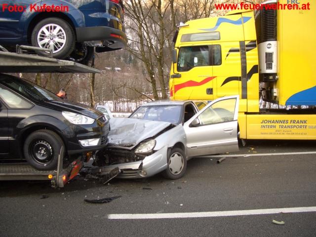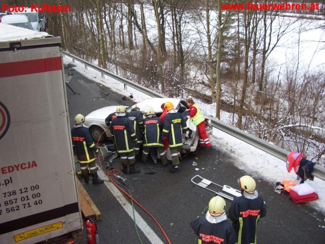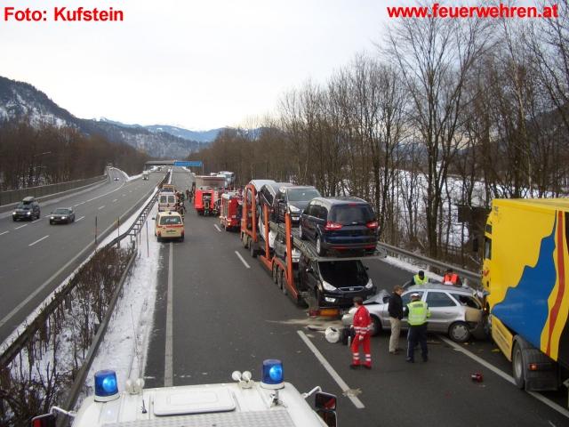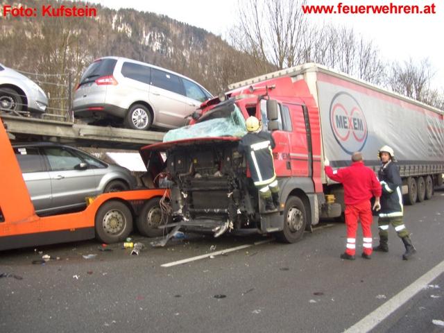 Aus noch ungeklärter Ursache kam es kurz vor der Ausfahrt Kufstein Süd zu einem folgenschweren Verkehrsunfall. Ein PKW wurde von einem hinter ihm fahrenden Lastkraftwagen auf den vor ihm fahrenden Autotransporter aufgeschoben. Durch die Wucht des Aufpralls wurde ein Fahrzeuginsasse des PKW getötet, der schwerverletzte Fahrer des PKW´s musste mittels hydraulischem Rettungsgerät aus dem Fahrzeug geborgen werden, eine weitere mitfahrende Person entstieg nur leichverletzt aus dem Wrack. Auch der leichtverletzte Fahrer des aufgefahrenen LKW´s musste mittels hydraulischen Rettungsgerät befreit werden.