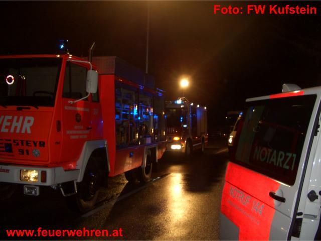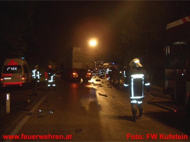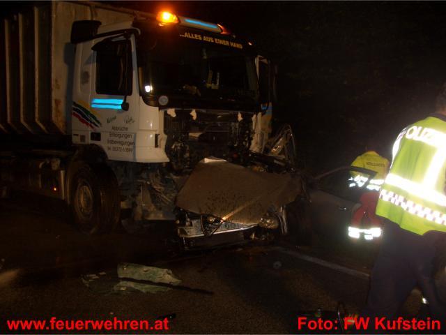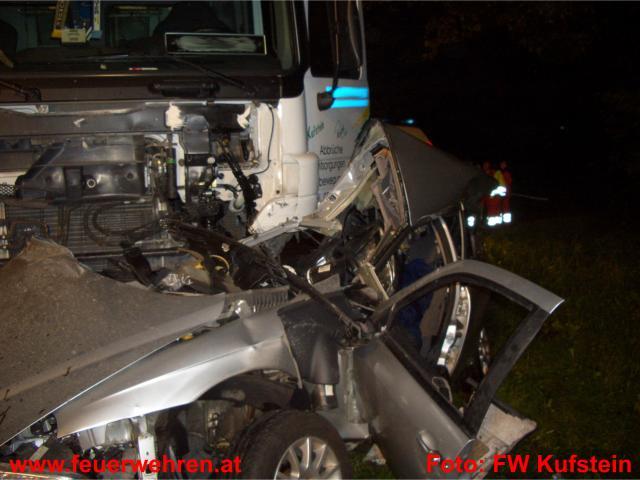 Am Donnerstag, den 17. September 2009 wurden die STADTFEUERWEHR Kufstein und die Feuerwehr Schwoich gegen 02:43 Uhr zu einem schweren Verkehrsunfall auf die Eiberg-Bundesstrasse alarmiert. Ein Lenker kam aus unbekannter Ursache ins Schleudern und prallte in weiterer Folge gegen einen entgegenkommenden LKW. Der Aufprall war so heftig, dass der Lenker des PKW noch an der Unfallstelle verstarb.