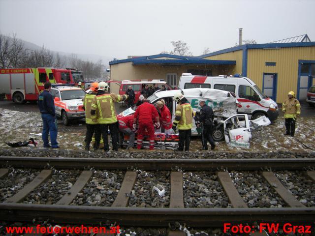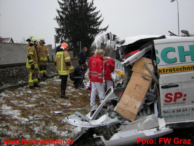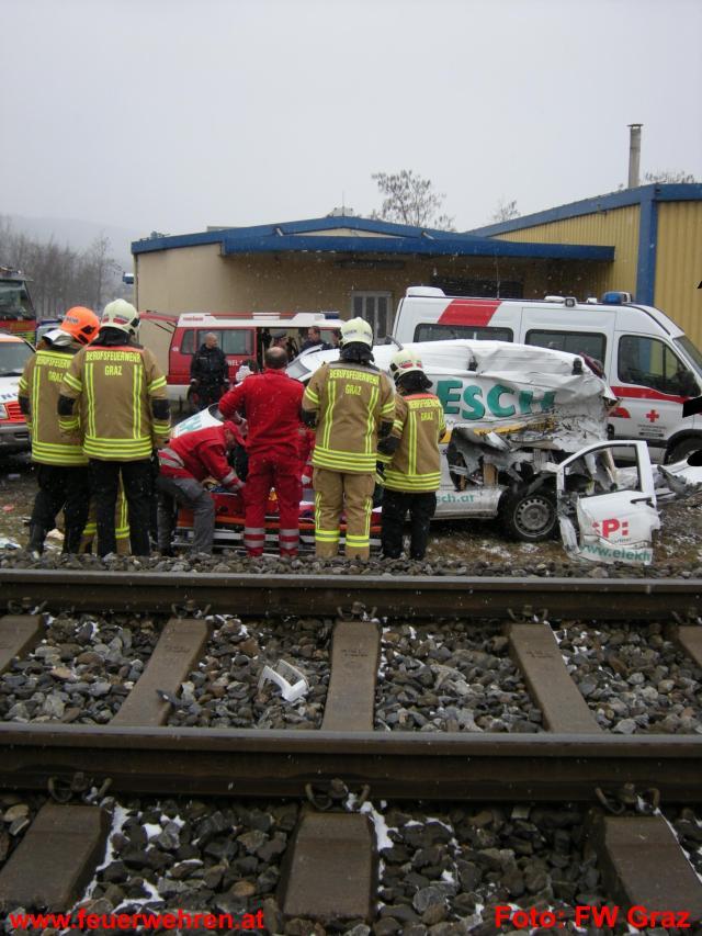 Unmittelbar nach diesem Ereignis langte erneut ein Notruf in der Zentrale der Berufsfeuerwehr am Lendplatz ein. Ein Kleintransporter dürfte in der Hafnerstraße das Haltesignal des unbeschrankten Bahnüberganges übersehen haben und wurde von einem Güterzug erfasst. Beim Eintreffen der Feuerwehr wurde der schwerverletzte Unfalllenker bereits vom Notarzt erstversorgt. Mit hydraulischem Rettungsgerät wurde die Fahrertür geöffnet, um der Rettung den Zugang zum Patienten zu erleichtern. Der Zugsführer erlitt einen Schock.