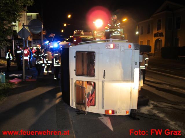Ein Kleinbus aus Niederösterreich wurde bei dem Zusammenprall mit einem PKW umgeworfen, die Lenkerin sowie die Beifahrerin konnten bereits vor dem Eintreffen der Berufsfeuerwehr aus dem Fahrzeug befreit werden. Unter der Einsatzleitung von OBR Ing. Heimo Krajnz wurde vor Eintreffen des Roten Kreuzes die Erstversorgung übernommen. Die Lenkerin des zweiten Fahrzeuges wurde nicht verletzt. Das Auto wurde allerdings am vorderen Teil schwer beschädigt, die Feuerwehr musste das ausgelaufene Kühlwasser binden.
