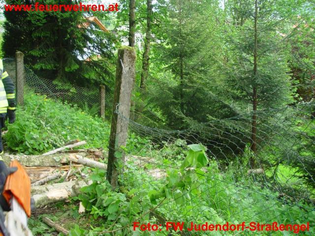 Eine Telefonleitung sowie ein Zaun wurden durch einen umgestürzten Baum am Waldweg zerstört. Der Baum wurde mittels der Motorkettensäge entfernt sowie der Zaun interimistisch repariert.