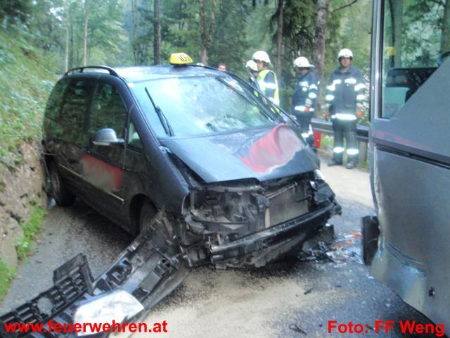 In einer Engstelle in Fahrtrichtung Johnsbach kollidierte aus noch unbekannter Ursache ein Taxifahrzeug mit einem Linienbus. Beide Taxiinsassen wurden verletzt, wobei einer schwer verletzt mit dem ÖAMTC-Rettungshubschrauber ins Krankenhaus geflogen werden musste.