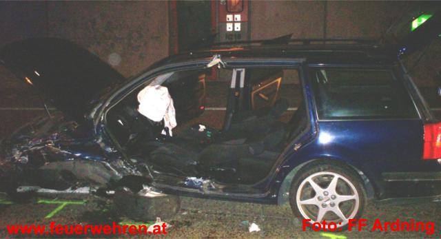 Beim Eintreffen der Einsatzkräfte und der Kontaktaufnahme mit der Tunnelwarte Ardning stellte sich heraus, dass es im nördlichen Teil des Bosrucktunnels zu einem Zusammenstoß mehrerer PKW gekommen sein musste. Sofort rückte die FF-Ardning mittels KRFS-Tunnel vor, um eine erste Lageerkundung durchzuführen. Dabei wurde festgestellt, dass es zu einem Frontalzusammenstoß zweier PKW gekommen und eine Person noch im Fahrzeug eingeklemmt war.