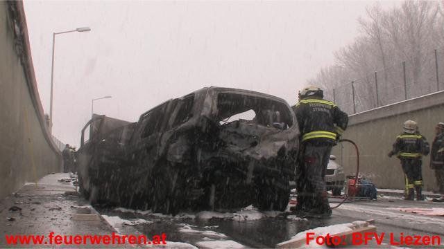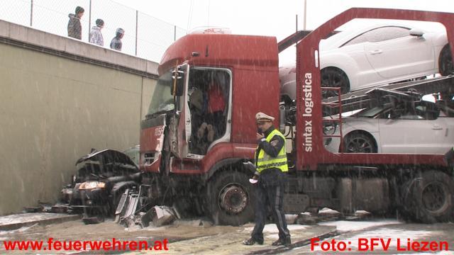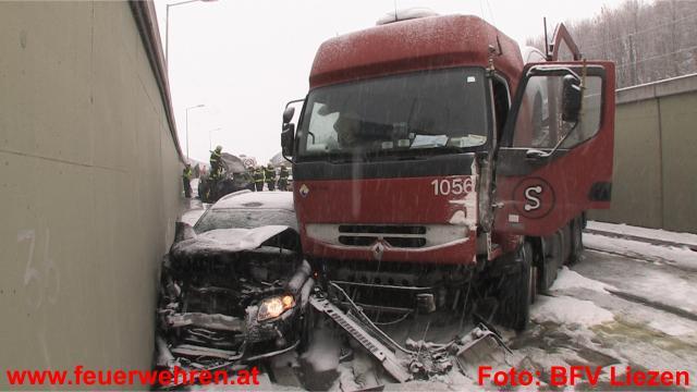 Heute, kurz vor 13:30 Uhr ereignete sich auf der schneeglatten Ennstalbundesstraße, Höhe westliche Wanne Stainach, ein tödlicher Verkehrsunfall. Insgesamt waren ein mit 8 neuen PKW beladener Sattelschlepper, 3 PKW und 1 Kleinbus am Unfall beteiligt. Einer der PKW begann zu brennen, für dessen beiden Insassen kam jede Hilfe zu spät.