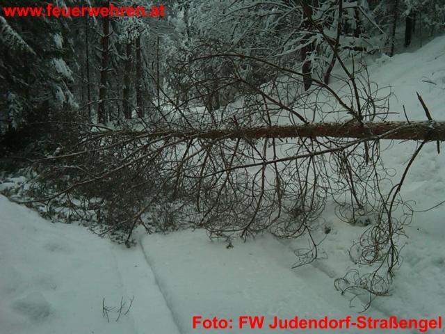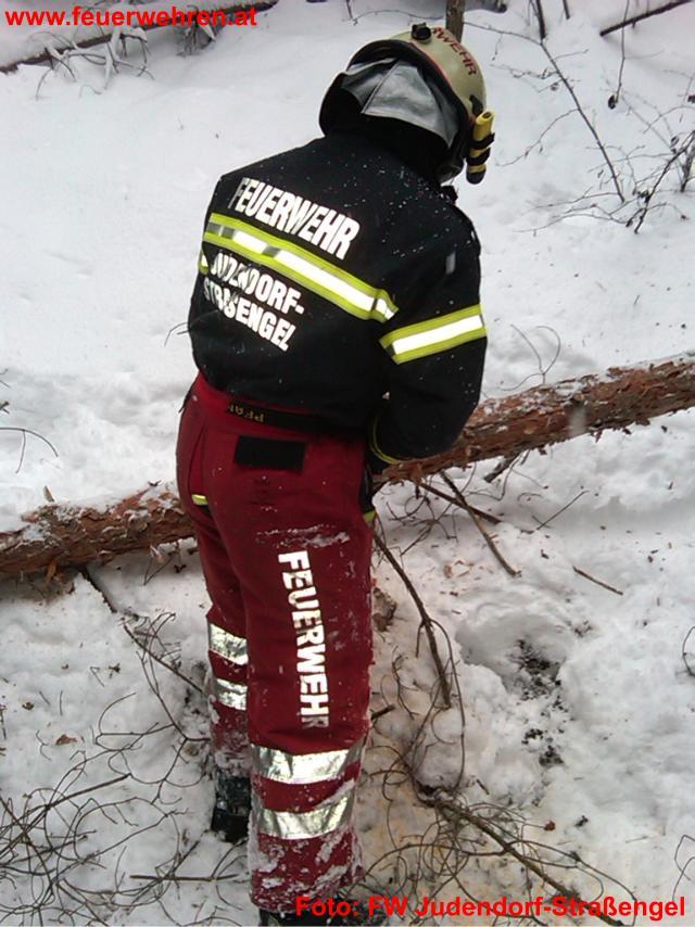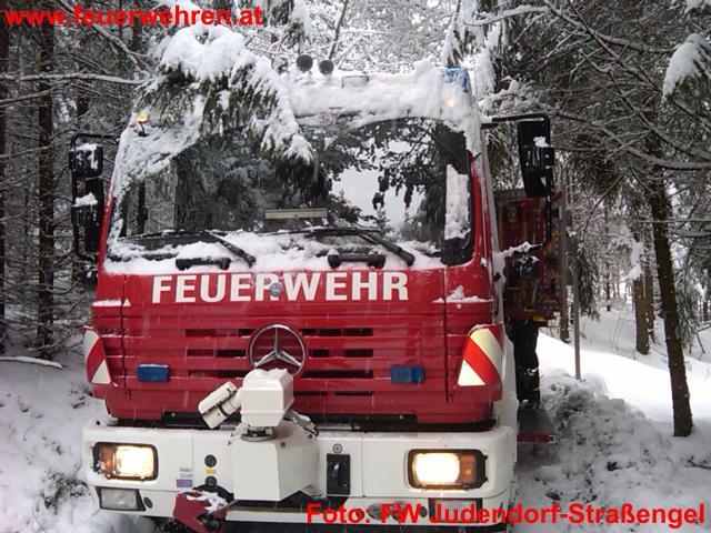 Auch dieses Mal stürzten mehrere Bäume auf eine Zufahrtsstraße am Kugelberg auf Grund der Schneelast um. Da dies die einzige Zufahrt zu den zwei Familienhäusern ist, waren die Bewohner kurzzeitig von der Außenwelt abgeschnitten. Die Feuerwehr rückte mit dem Rüstlöschfahrzeug zum Einsatzort aus. Schon die Anfahrt war für die Einsatzkräfte auf der noch nicht geräumten Straße sehr mühsam. Mittels der Motorkettensäge und der Seilwinde konnten die Bäume entfernt werden.