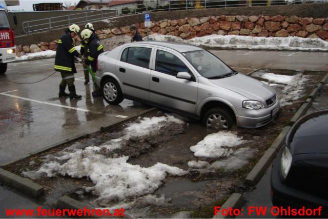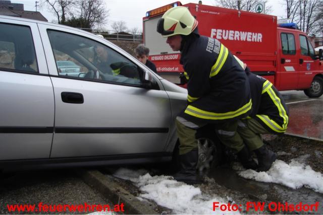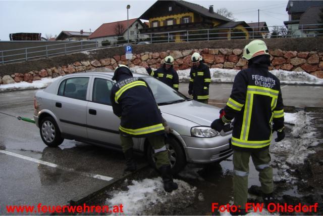 Die diesjährige Einsatzserie der Ohlsdorfer Feuerwehr hält weiter an. Am Donnerstag, den 13. Jänner 2011 wurden die Einsatzkräfte um 10:30 Uhr von der OÖ Landeswarnzentrale zu einer nicht alltäglichen Fahrzeugbergung alarmiert. Eine Fahrzeuglenkerin fuhr mit ihrem Fahrzeug beim Spar-Parkplatz über die Parkplatzbegrenzung und blieb darauf im Wassergraben hängen.