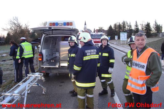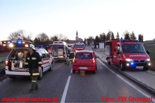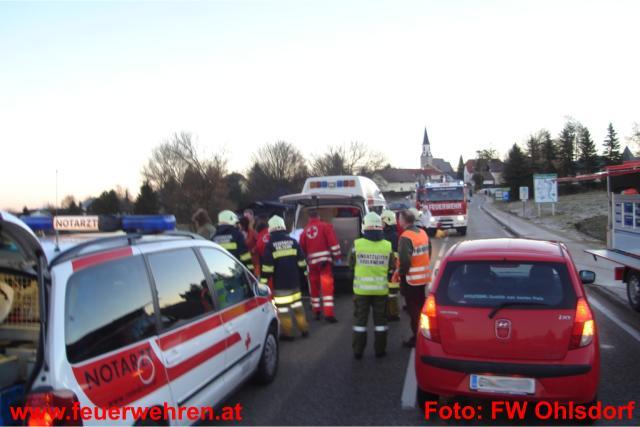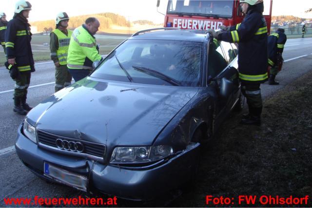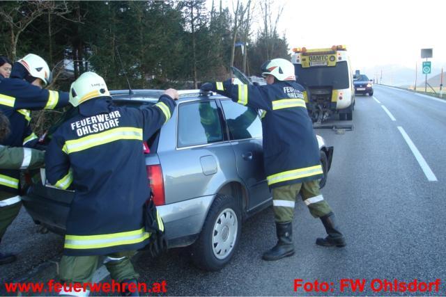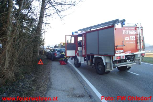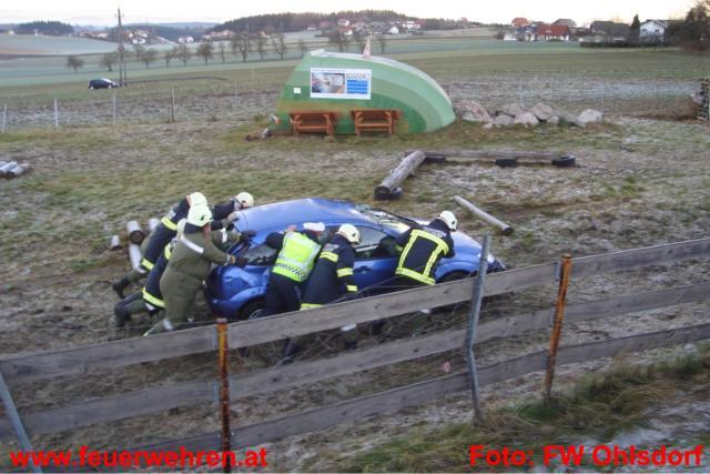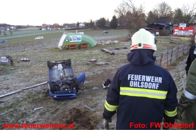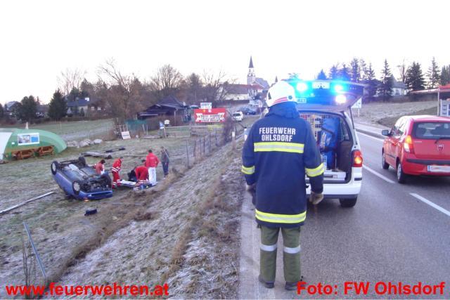 Durch einen schweren Verkehrsunfall bei der Ortsausfahrt von Ohlsdorf wurde die Feuerwehr Ohlsdorf am Montag, den 17. Jänner 2011 um 07:42 Uhr alarmiert. Eine Pkw Lenkerin kam auf der eisglatten Landesstraße ins Rutschen und stürzte dabei eine fünf Meter hohe Böschung hinab, wobei sich das Fahrzeug überschlug und am Dach liegend zum Stehen kam. Dabei durchschlug das Fahrzeug einen Zaun des angrenzenden „Trail Garten“.