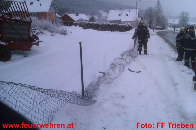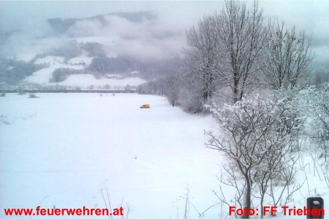 Zu einem spektakulären Verkehrsunfall wurden am Mittwoch, den 26.01.2011, die Feuerwehren St. Lorenzen im Paltental und Trieben-Stadt von Florian Liezen gerufen. Ein Lieferwagen der Post kam auf Höhe St. Lorenzen aus bisher ungeklärter Ursache rechts von der Fahrbahn ab und durchstieß einen Zaun. In weiterer Folge fuhr das Fahrzeug quer über beide Fahrspuren direkt in eine Wiese. Trotz des Neuschnees wurde der Lieferwagen kaum gebremst und kam erst an einer Geländekante knapp 150 Meter unterhalb der Bundesstraße zu stehen.