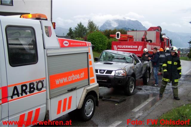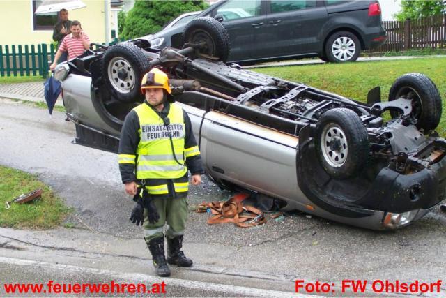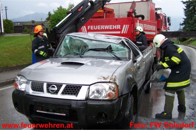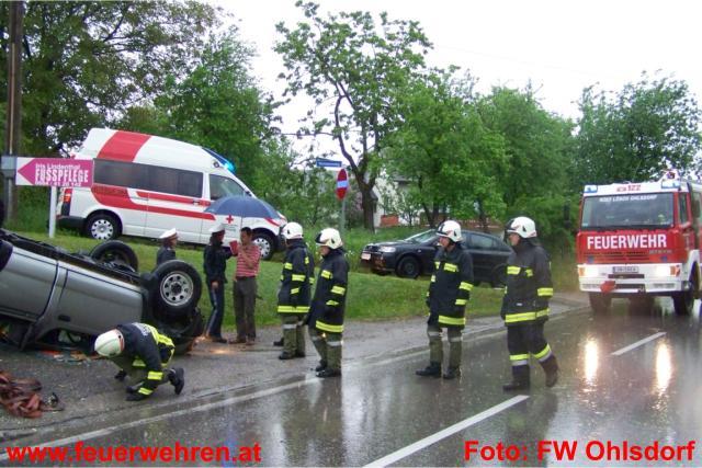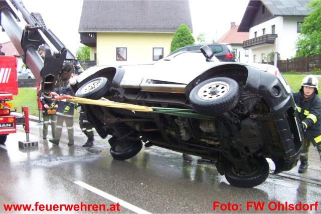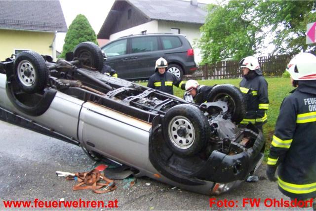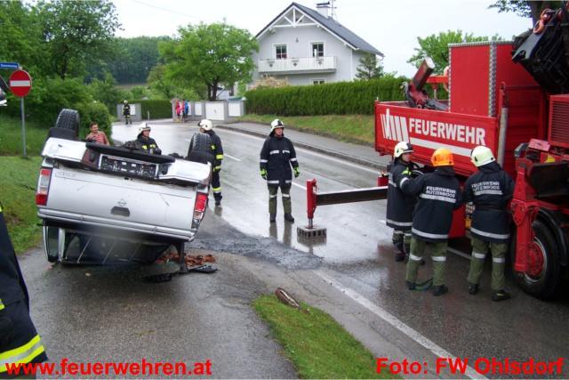 Mitten in den Arbeiten am beschädigten Maibaum im Ohlsdorfer Zentrum wurde die Feuerwehr Ohlsdorf am Donnerstag, den 12. Mai 2011 zu einem Verkehrsunfall nach Ehrendorf alarmiert. Ein Pkw-Lenker kam aus unbekannter Ursache in einer starken Rechtskurve ins Schleudern, prallte dabei gegen eine Böschung und überschlug sich. Beide Insassen konten sich zum Glück selbst aus dem Fahrzeug befreien und wurden zur Kontrolle in das LKH Gmunden eingeliefert. Die Polizei Gmunden übernahm die weiteren Ermittlungen.