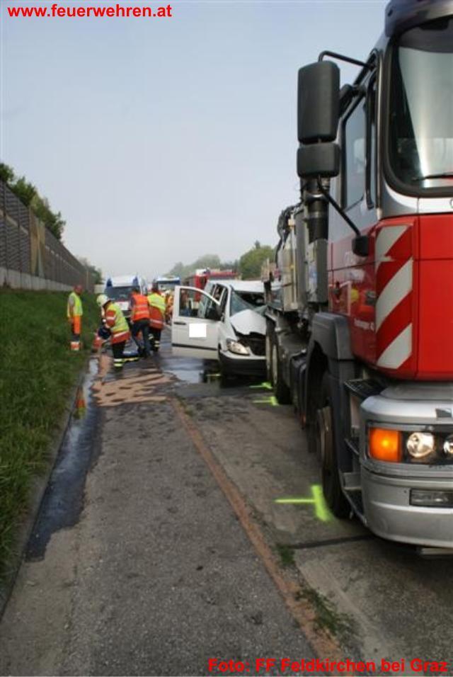 Die FF Feldkirchen begann unterdies, unterstützt von den Kräften der Autobahnmeisterei, mit den Aufräumarbeiten, um die beiden gesperrten Fahrstreifen der Südautobahn wieder frei zu bekommen. Da es sich bei dem in das Unfallgeschehen verwickelte Lastkraftwagen um einen Pumpenwagen handelte, dessen Inhalt umgepumt werden musste, wurde ein gleichartiges Fahrzeug der selben Firma angefordert. Um bei diesen Arbeiten Absicherungsmaßnahmen durchführen zu können und auch um die in großer Menge ausgetretenen Betriebsflüssigkeiten binden zu können, wurde das Ölschadensfahrzeug der FF Werndorf angefordert.