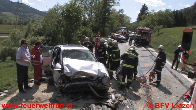 Aus noch ungeklärter Ursache kollidierten heute Nachmittag auf der B320 im Gemeindegebiet von Unterburg zwei PKW (mit Liezener bzw. Gröbminger Kennzeichen) frontal miteinander. Alle drei Insassen der beiden Fahrzeuge wurden dabei massiv in den Fahrgastzellen eingeklemmt und mussten mittels hydraulischem Rettungsgerät von den Feuerwehren Unterburg und Stainach befreit werden. Die Patienten wurden nach Erstversorgung durch das Notarztteams des Roten Kreuz, der Notärzte der Hubschrauberbesatzungen C-6 und C-14 sowie zweier zufällig anwesender Ärzte, darunter der Bezirksfeuerwehrarzt des BFV Mattersburg Primarius Dr. Michael Gruska, erstversorgt und mit schweren Verletzungen in die Krankenhäuser Graz, Salzburg und Schladming transferiert.