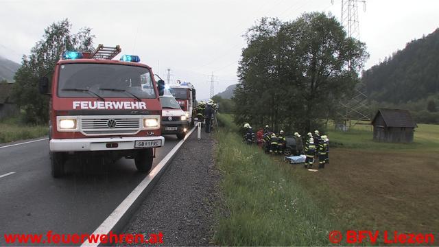 Glück im Unglück für einen PKW-Lenker am Morgen des 10.06.2012 auf der Öblarner Landesstraße. Ein Pensionist kam gegen 6 Uhr mit seinem PKW von der Fahrbahn (Fahrtrichtung Westen) ab und krachte gegen ein Brückengeländer. Das Fahrzeug wurde über eine Böschung geschleudert und landete auf einem Feld, gut zwei Meter unter Straßenniveau.