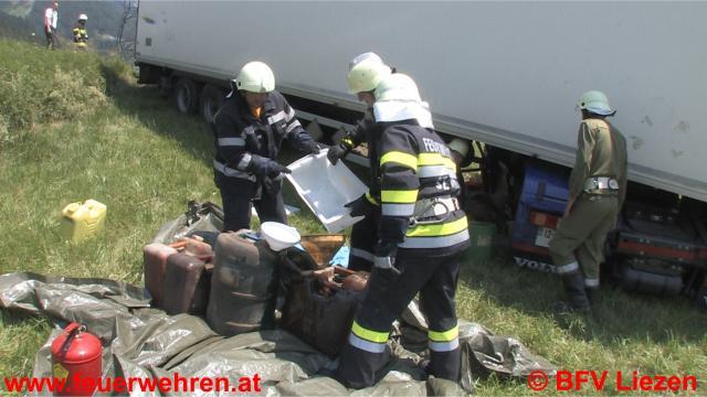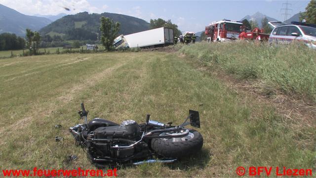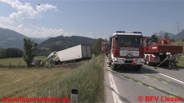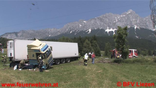Am 19.06.2012 kurz vor Mittag geriet ein LKW-Zug aus Irland (Fahrtrichtung Salzburg) auf der Ennstalbundesstraße (Höhe Diemlern) auf die Gegenfahrbahn und stürzte in weiterer Folge über die Straßenböschung auf ein Feld südlich der B320. Ebenfalls in den Unfall verwickelt wurde der Lenker eines Motorrades mit Wiener Kennzeichen, er landete ebenfalls auf der Wiese. Die genaue Unfallursache wird von der Polizei Gröbming ermittelt.