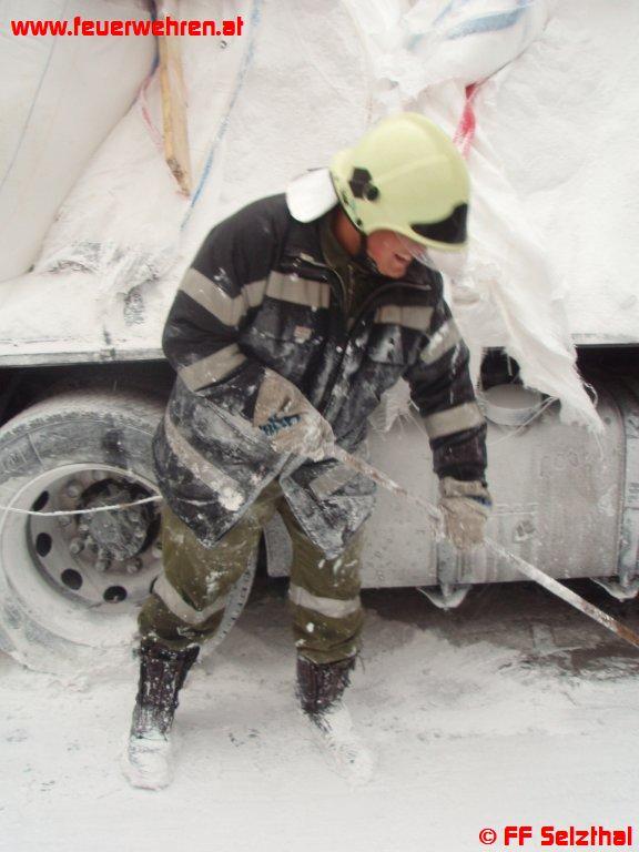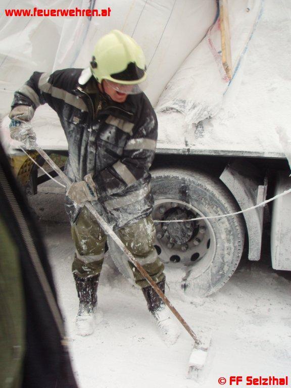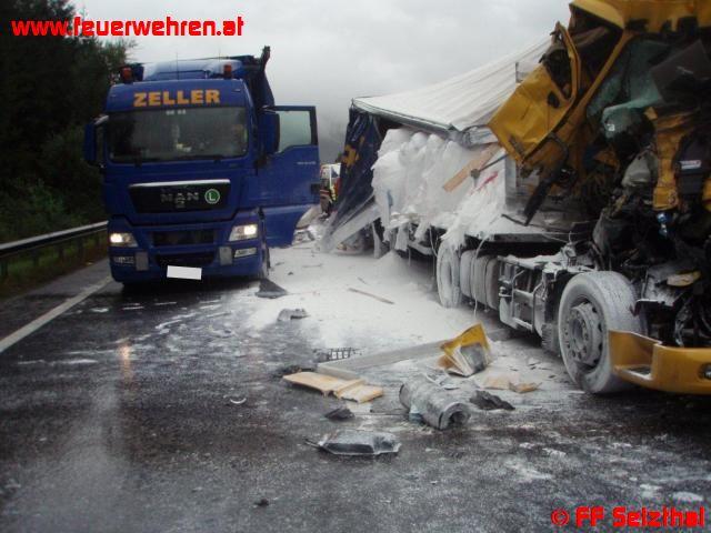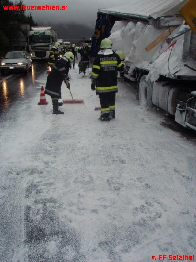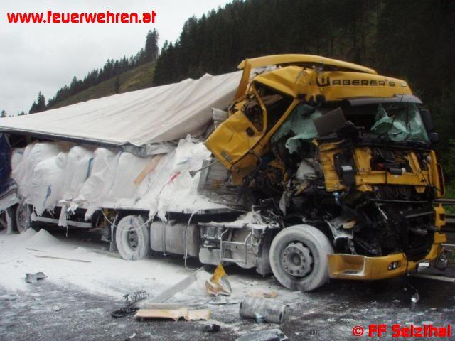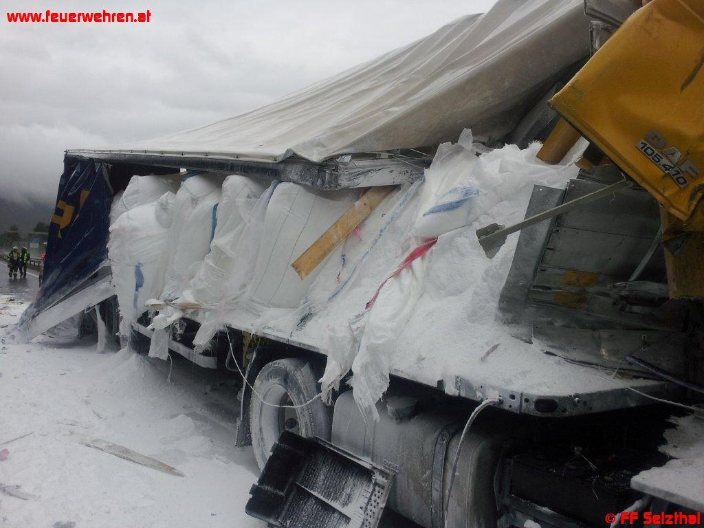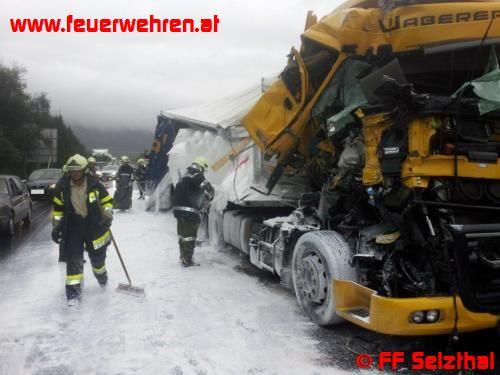 Am Einsatzort fanden wir zwei LKW’s die durch einen Auffahrunfall stark beschädigt waren vor. Die Lenker wurden dabei nicht verletzt, jedoch war die Fahrbahn stark mit Magnesiumhydroxid verschmutzt.