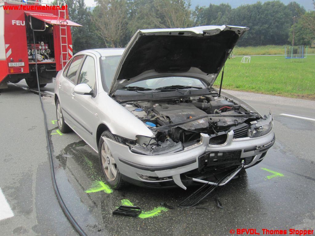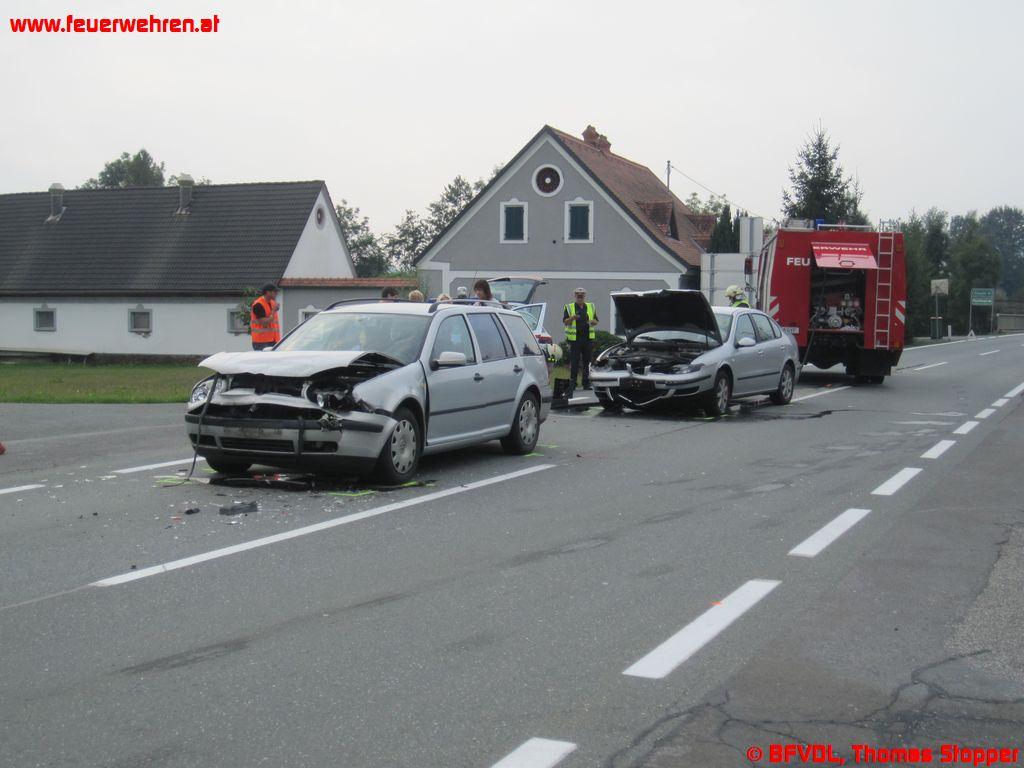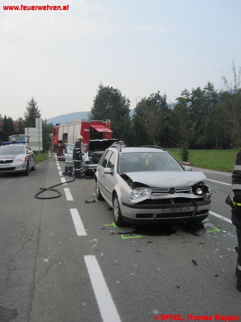 2 Wochen nach dem Verkehrsunfall mit 4 Verletzten wurde die Freiwillige Feuerwehr Grünberg-Aichegg in den Morgenstunden des 05. September 2012 erneut zu einer Fahrzeugbergung alarmiert. Wenige Meter von der letzten Unfallstelle entfernt konnte bei einem Abbiegemanöver ein nachkommender Fahrzeuglenker nicht mehr rechtzeitig bremsen und fuhr auf die zwei vor ihm stehende PKWs auf.