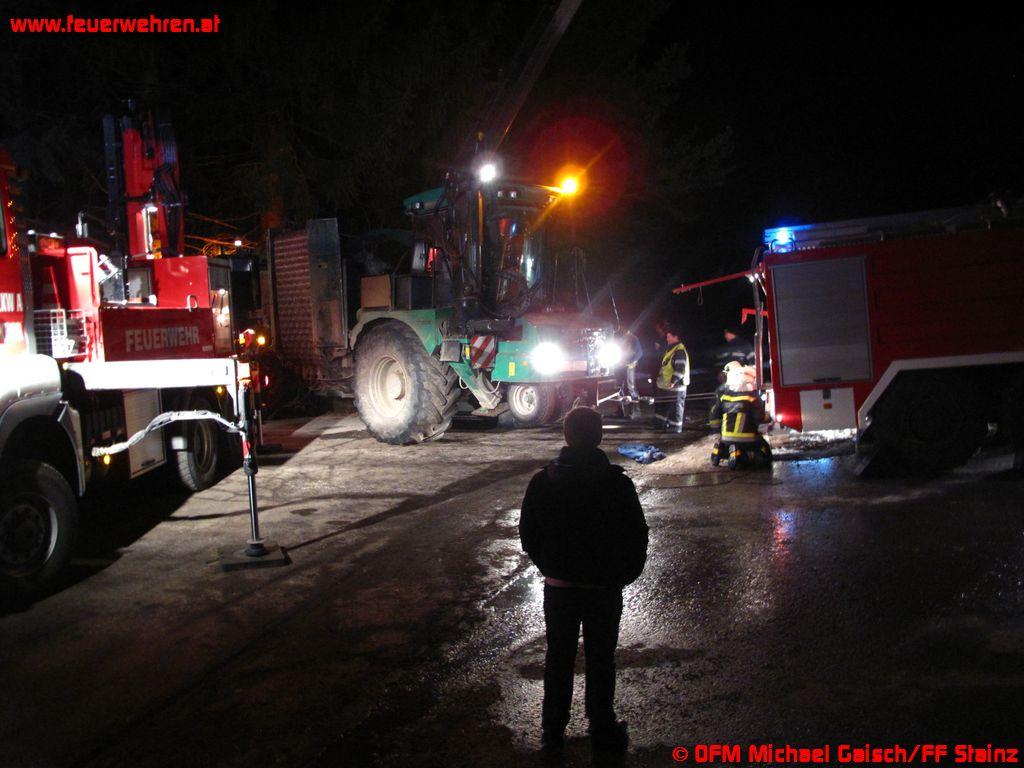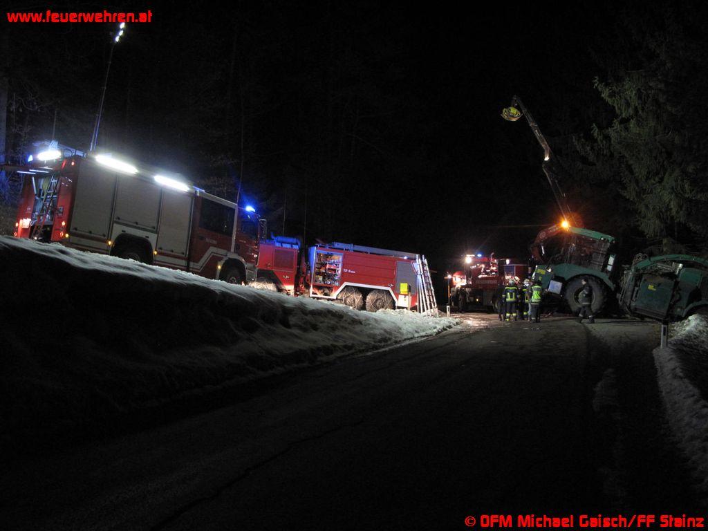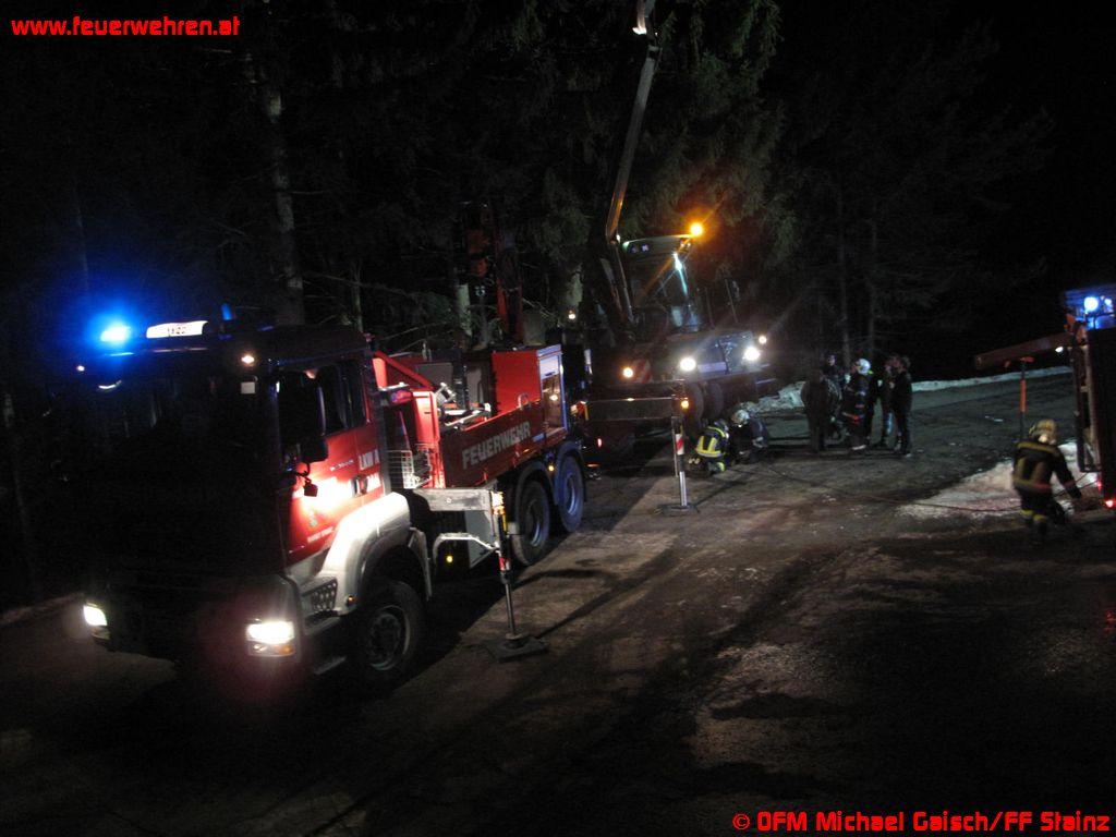 Mehrere Bäume verhinderten ein weiteres Abstürzen der Arbeitsmaschine über die steile Böschung. Die telefonische Alarmierung der FF Bad Gams erfolgte gegen 17.00 Uhr. Die mehr als 20 Tonnen schwere Maschine wurde zuerst gesichert. Der Einsatzleiter, HBI Ernst Größbauer, veranlasste die Sperrung der Landesstraße und die Nachalarmierung der Feuerwehr Stainz.