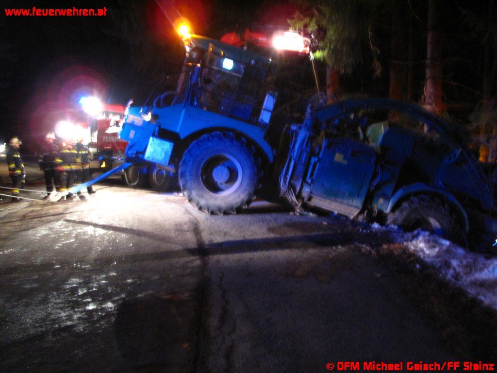 Nach der weiteren Lageerkundung wurde beschlossen, die Bergung mittels Kran und mit zwei Seilwinden mit einer Gesamtzugkraft von 32 Tonnen durchzuführen. Durch den LKW-A Kran der FF Stainz wurde die Hackgutmaschine am Heck angehoben. Mittels der beiden Seilwinden, vom Rüstlöschfahrzeug Bad Gams und vom Tanklöschfahrzeug der FF Stainz, konnte die Maschine auf die Fahrbahn zurückgezogen werden.