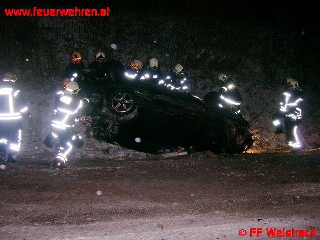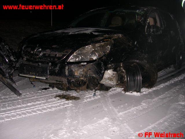 Auf der schneeglatten LH 85 bei Kilometer 20,3 kam ein Fahrer mit seinem Opel Signum von der Fahrbahn ab und prallte frontal in die Straßenböschung. Durch die Wucht des Aufpralls überschlug sich der Wagen, wobei dieser auf dem Dach zum Stillstand kam. Als erste Maßnahme wurde eine Absicherung der Unfallstelle mit beiden Feuerwehrautos durchgeführt um die Sicherheit der Einsatzkräfte gewährleisten zu können. Danach wurde ein Brandschutz aufgebaut und mittels Muskelkraft der PKW auf die Räder gestellt. In weitere Folge wurde die Batterie abgeklemmt und der PKW gesichert abgestellt. Zum Glück konnte sich der Fahrer selbst aus dem deformierten Fahrzeug befreien. Zum Schluss wurde die Fahrbahn von den herumliegenden Fahrzeugteilen gereinigt und die ausgelaufenen Betriebsmittel gebunden.