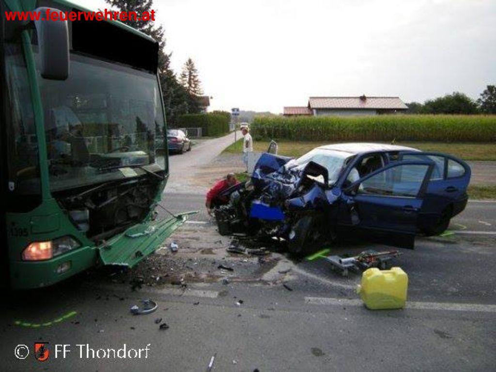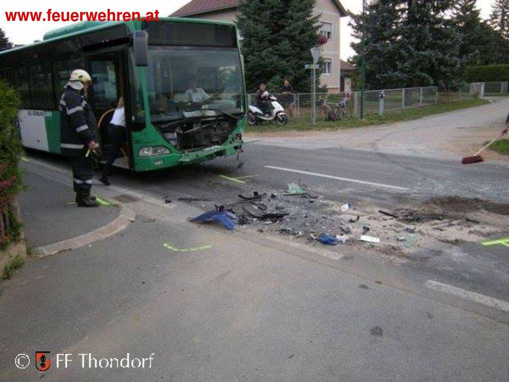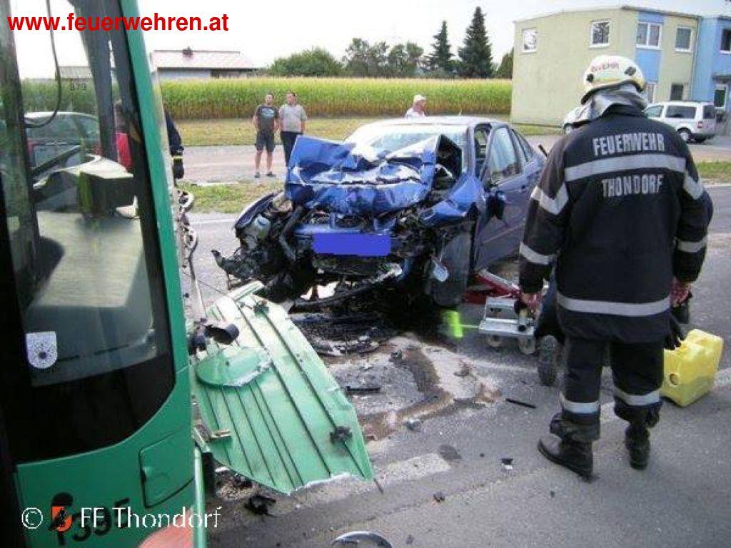 Aus ungeklärter Ursache ereignete sich in den frühen Morgenstunden des 22.08.2013 auf der B 73 im Ortsgebiet von Thondorf ein schwerer Verkehrsunfall. Dabei kam ein in Richtung Graz fahrender PKW Lenker mit seinem Fahrzeug auf die Gegenfahrbahn, kollidierte frontal mit einem entgegenkommendem Linienbus und wurde dabei schwer verletzt.