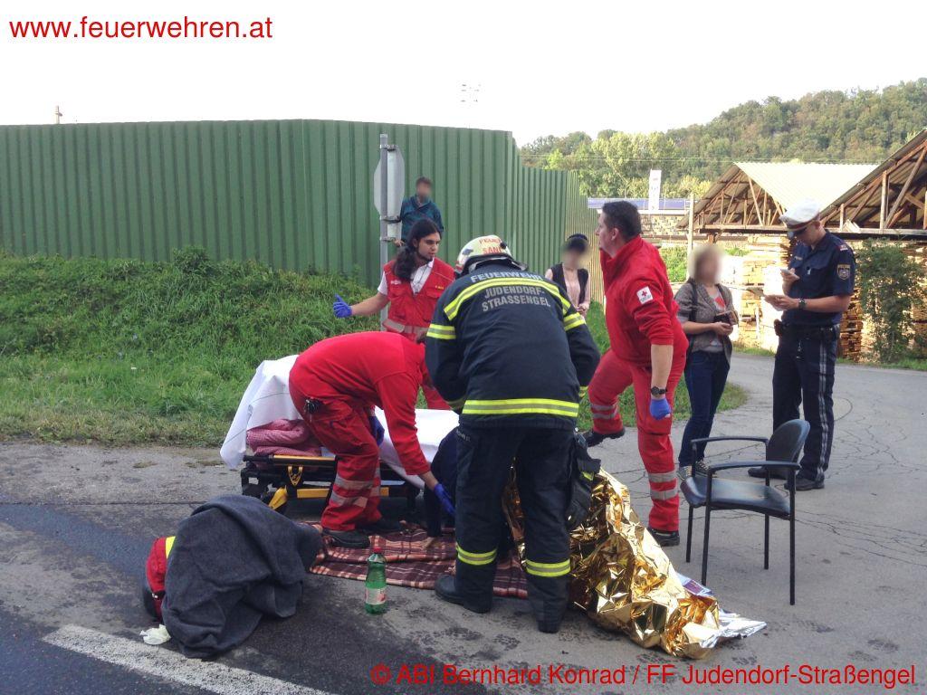 Um 16:22 Uhr wurden die Einsatzkräfte der Freiwilligen Feuerwehr Judendorf-Straßengel alarmiert. Aufgrund eines bestehenden Einsatzes der Feuerwehr rückte diese unmittelbar nach der Alarmierung zum Einsatzort aus. Nachdem der Einsatzleiter, Abschnittsbrandinspektor Bernhard Konrad, mit dem Rüstlöschfahrzeug am Einsatzort eintraf, fand dieser drei verletzte Personen, darunter zwei Frauen und einen Mann vor.