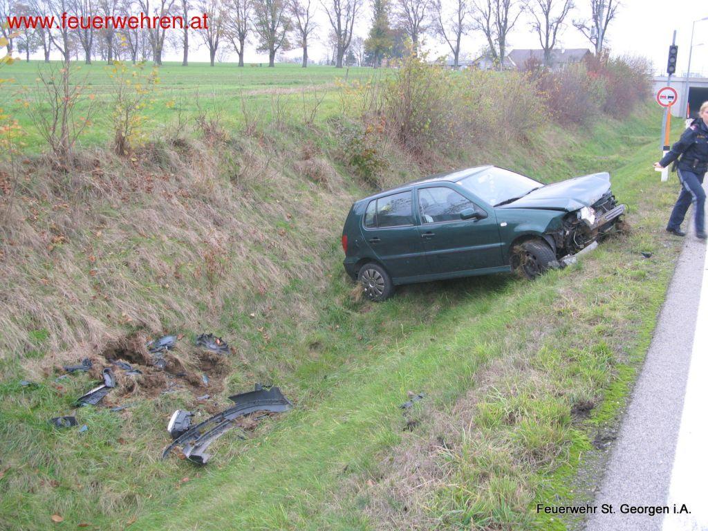 Ein PKW geriet aus noch ungeklärter Ursache auf das rechte Bankett, infolge kam er ins Schleudern, worauf er über die Gegenfahrbahn in den 2 Meter tiefen Graben schlitterte. Die Fahrzeuglenkerin wurde dabei unbestimmten Grades an der linken Hand verletzt.
